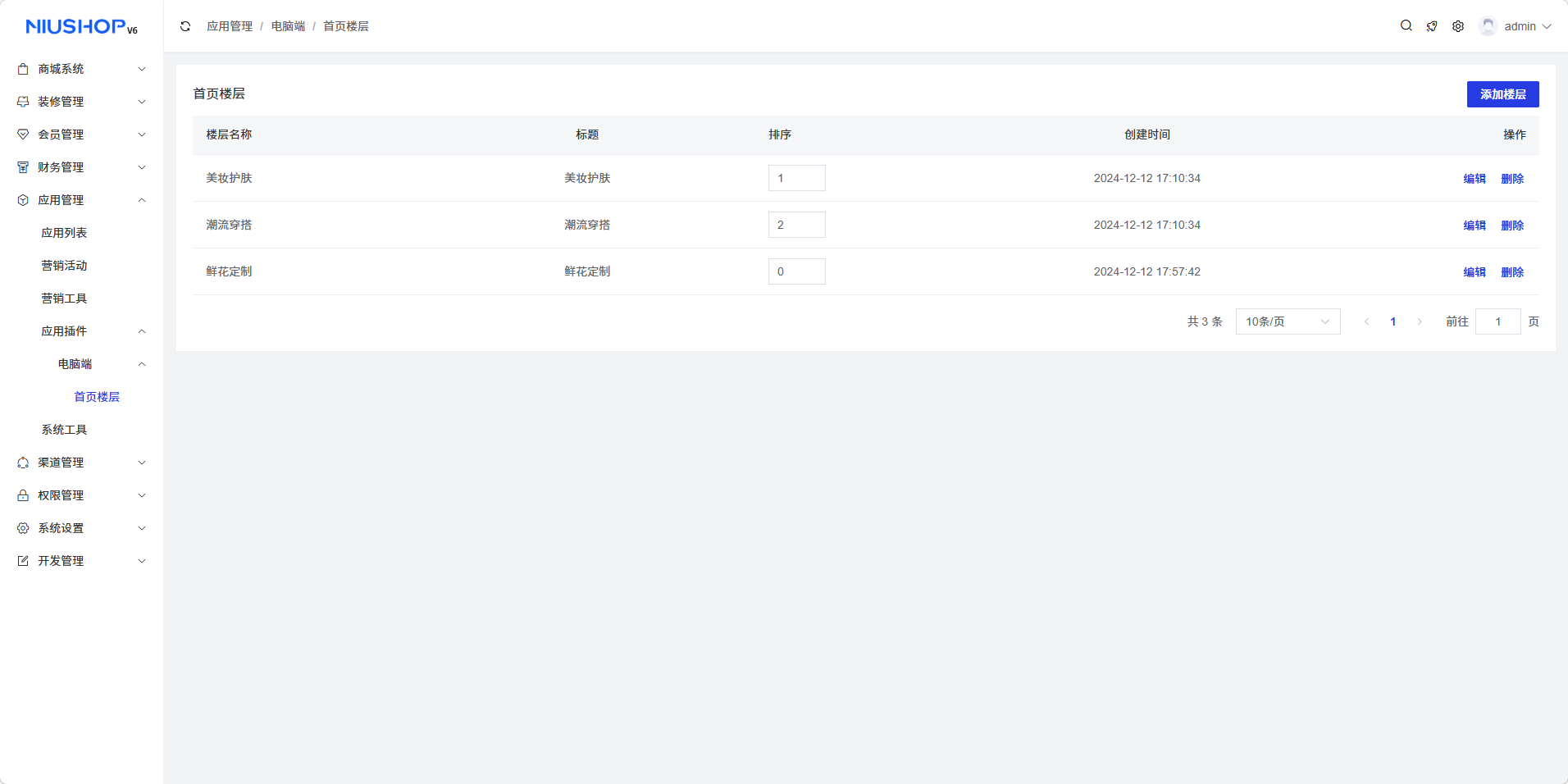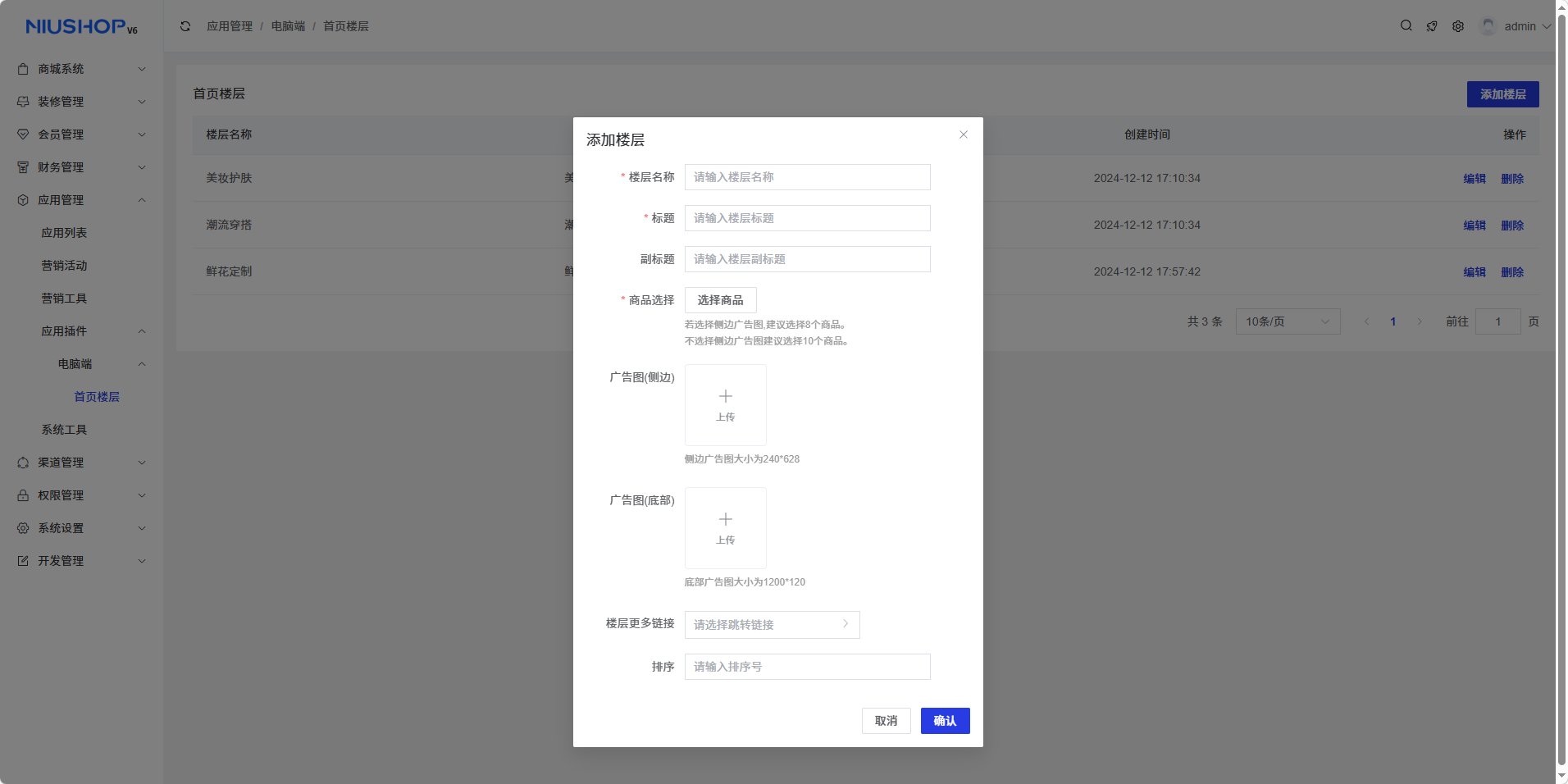 首页楼层页面用于管理电脑端首页的楼层设置,管理员可以创建、编辑和删除首页楼层,设置楼层的标题、商品、广告图等内容。