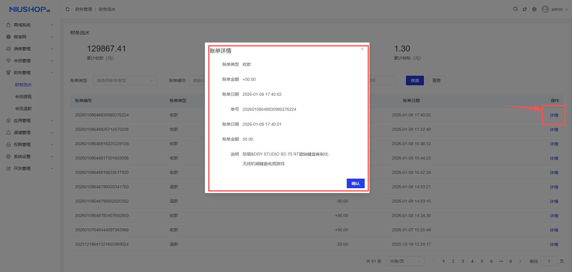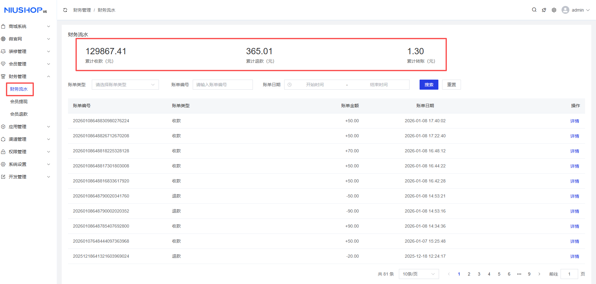 财务流水可以查看每笔交易的流水,展示累计收款、累计退款、累计转账金额。