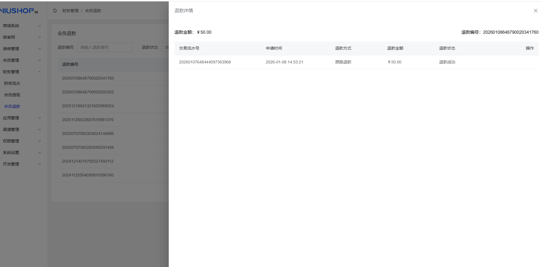 会员购买商品后申请退款且退款成功的订单才可在此处展示数据,支持通过退款编号/退款状态/申请时间来筛选退款信息。