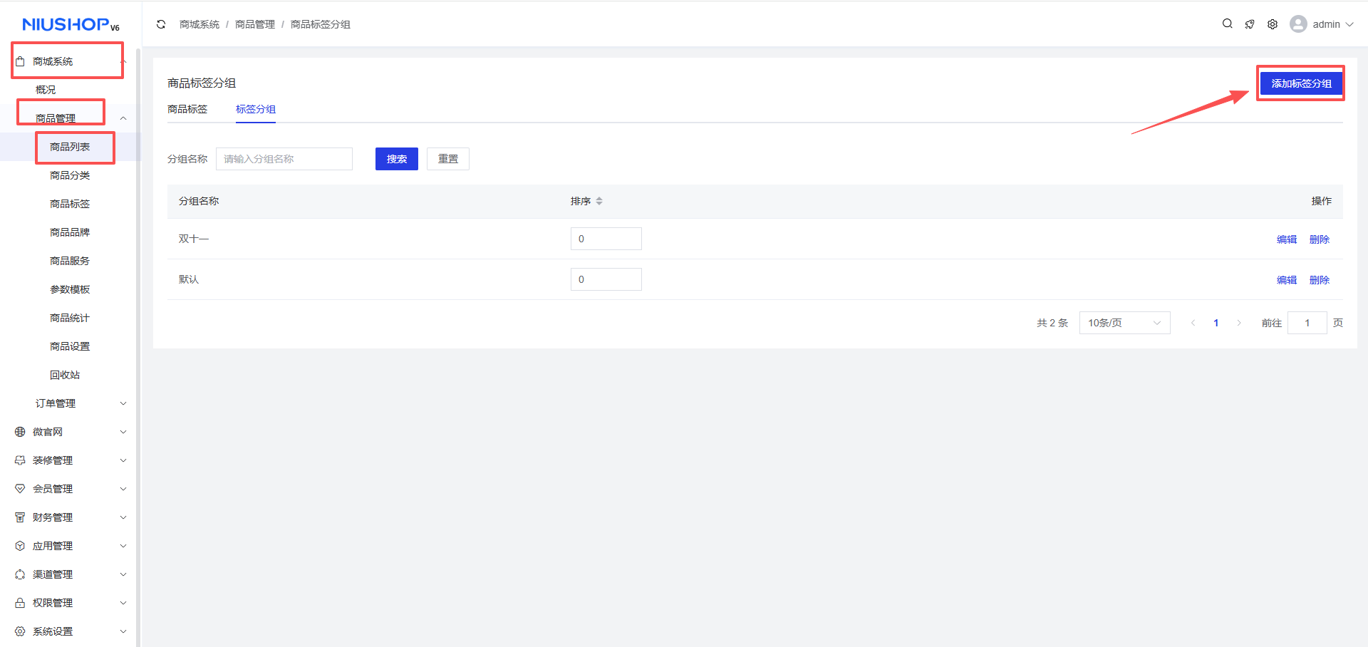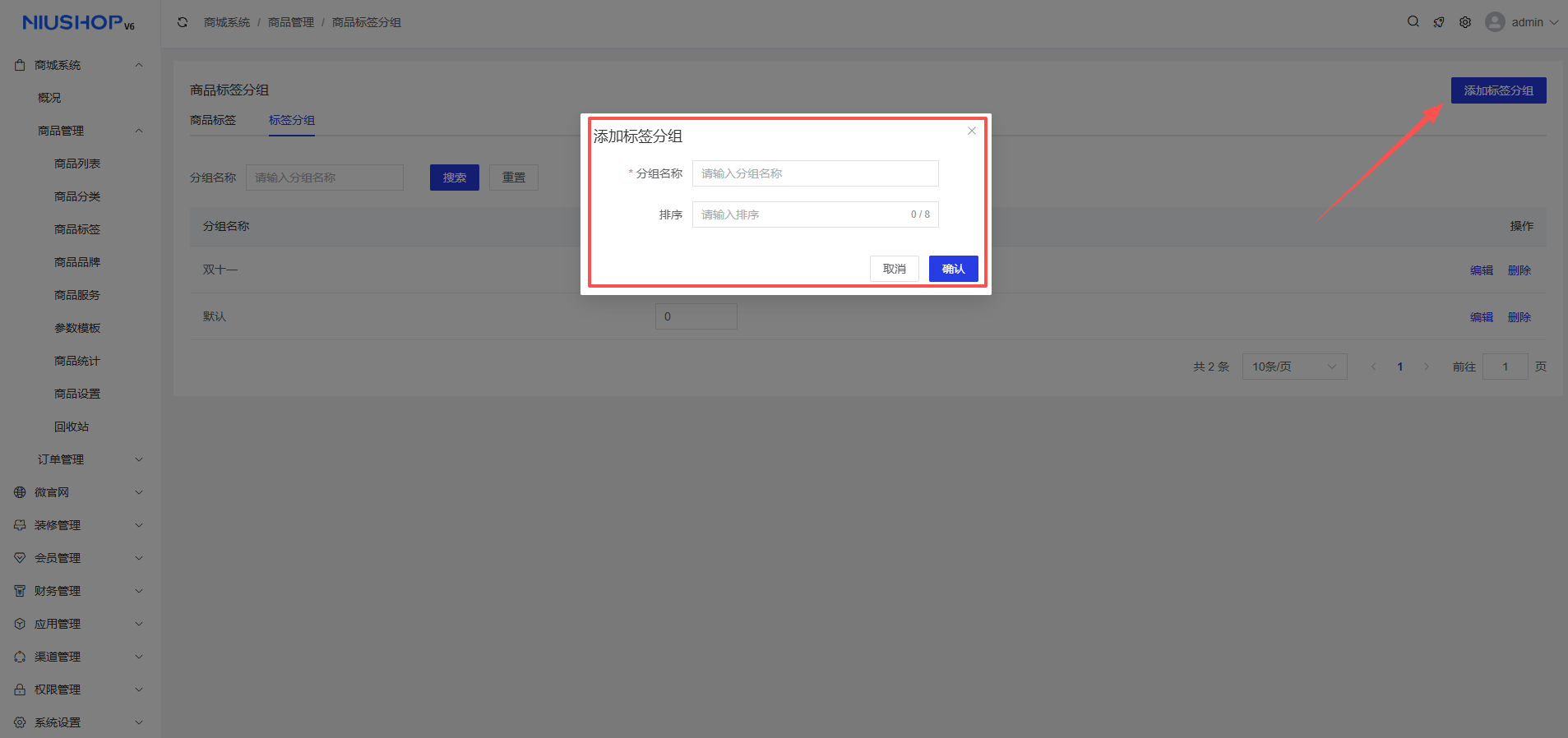 2、标签分组:商城系统 >商品管理 >商品标签 >添加标签分组