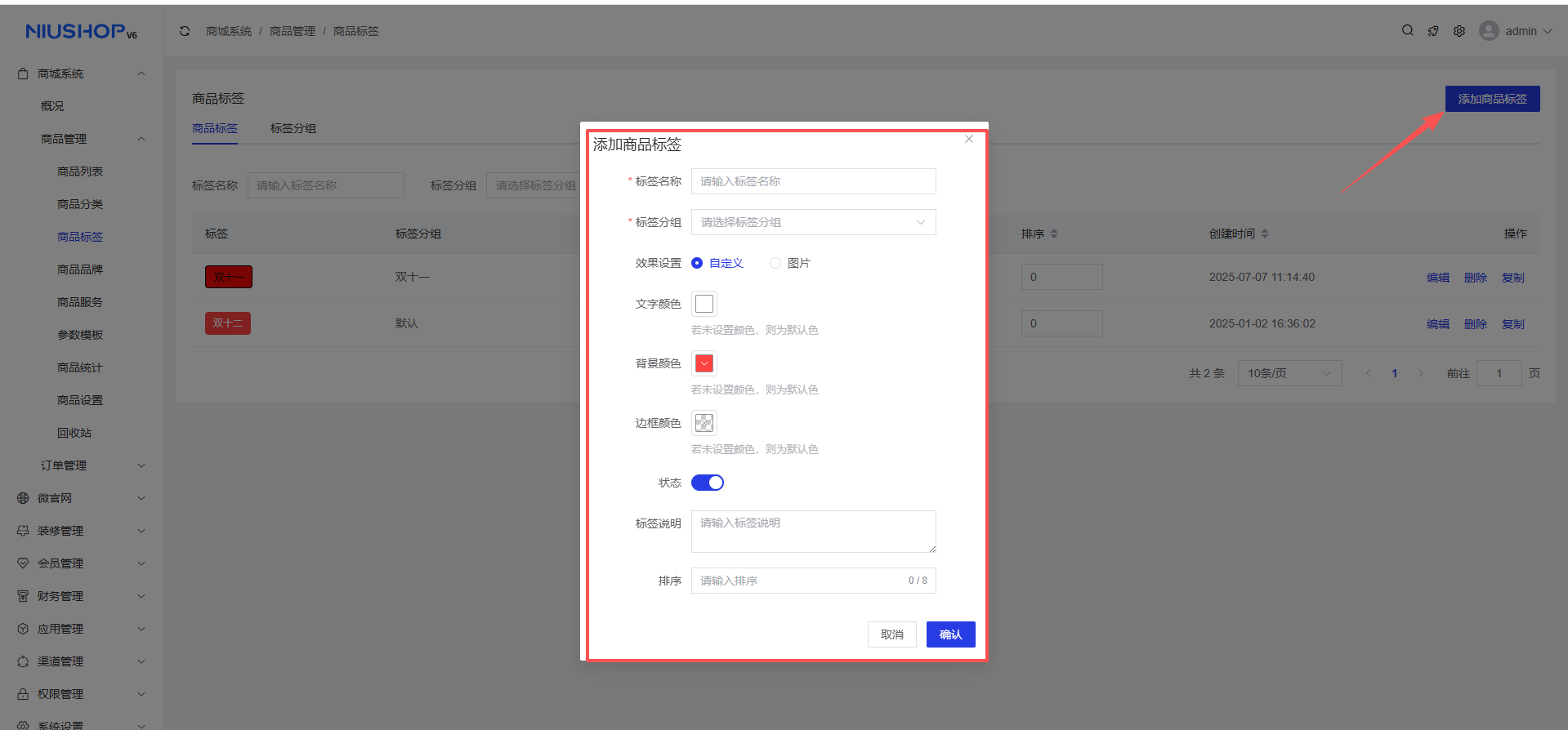 1、添加商品标签:商城系统 >商品管理 >商品标签 >添加商品标签