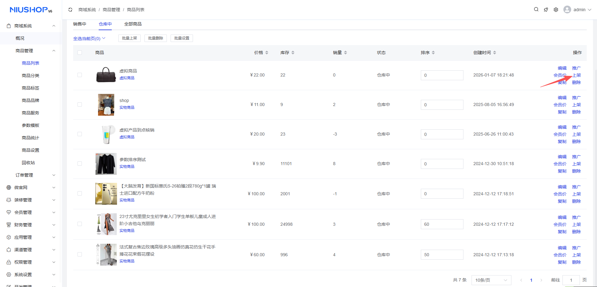 操作步骤: 商城系统 >商品管理 >仓库中> 上架