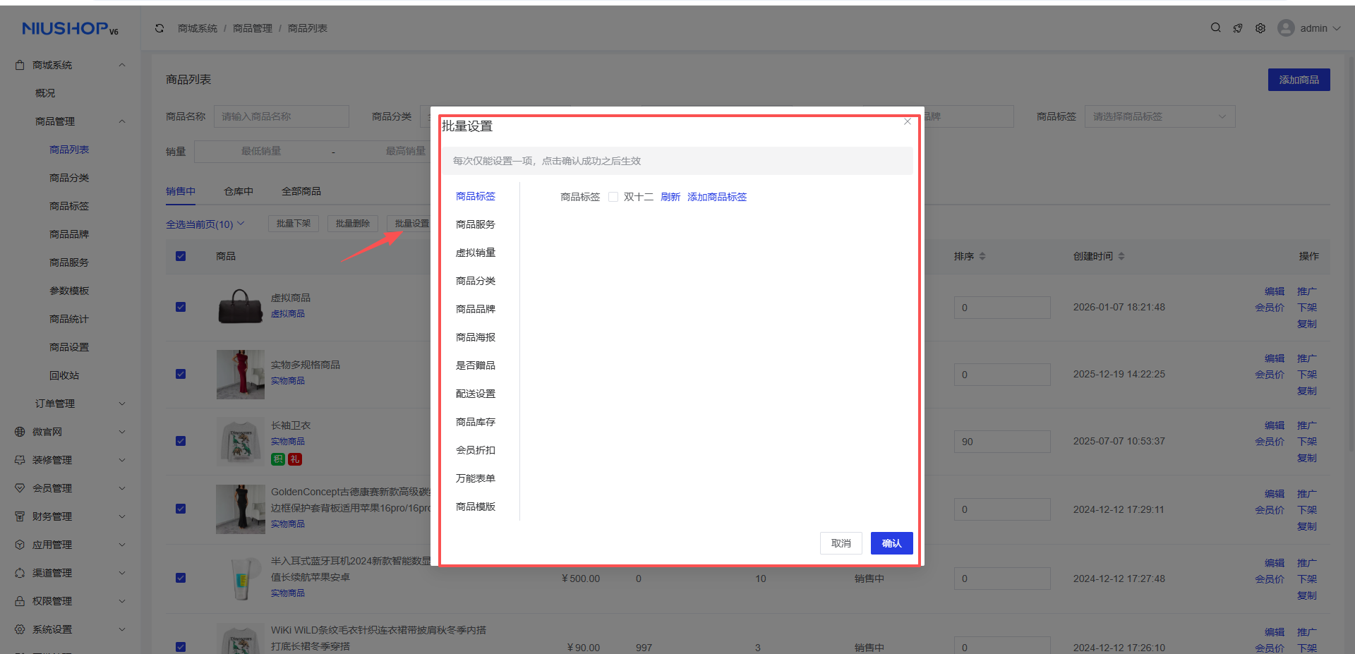 - 进行批量配送设置时,只针对实物商品有效,虚拟商品不支持批量配送设置