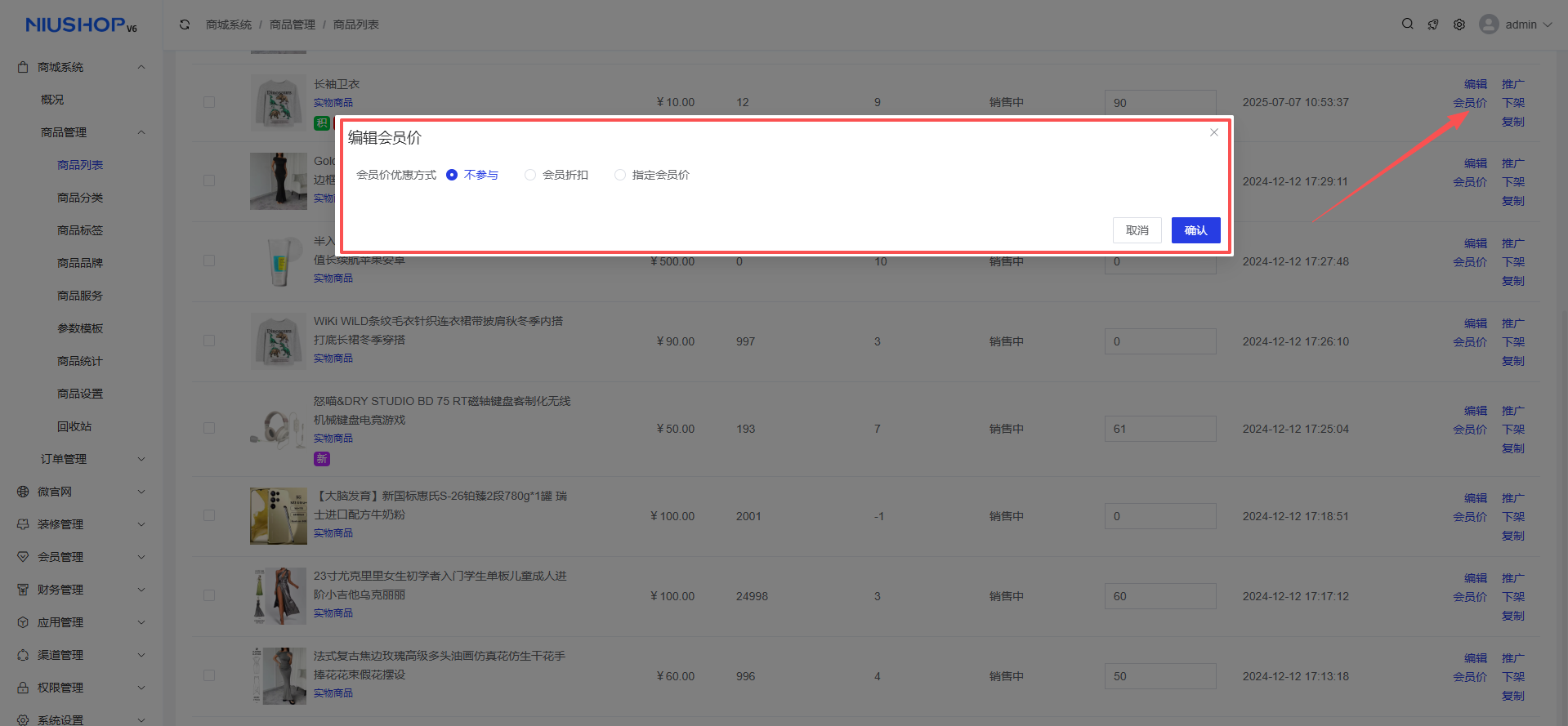 操作步骤: 商城系统 >商品管理 >商品列表 > 会员价