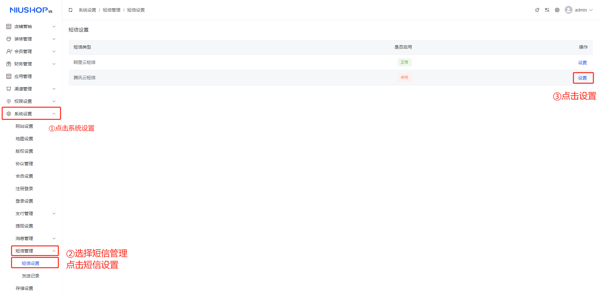 一、在后台点击系统设置,选择短信管理,点击短信设置,点击腾讯云短信设置