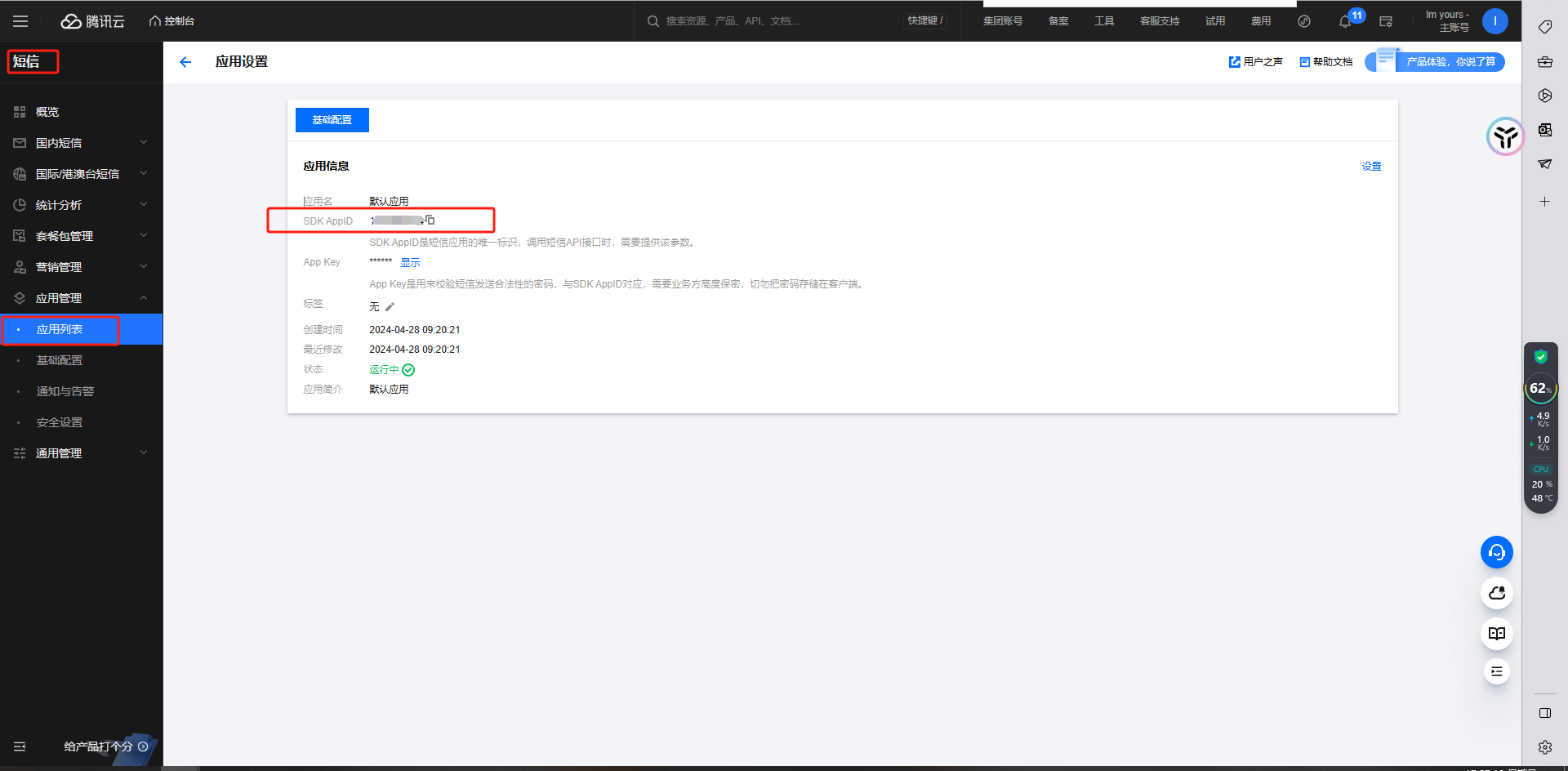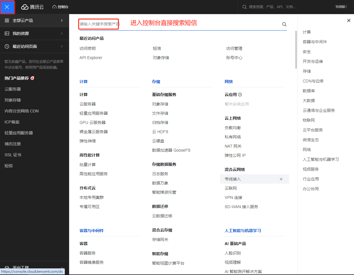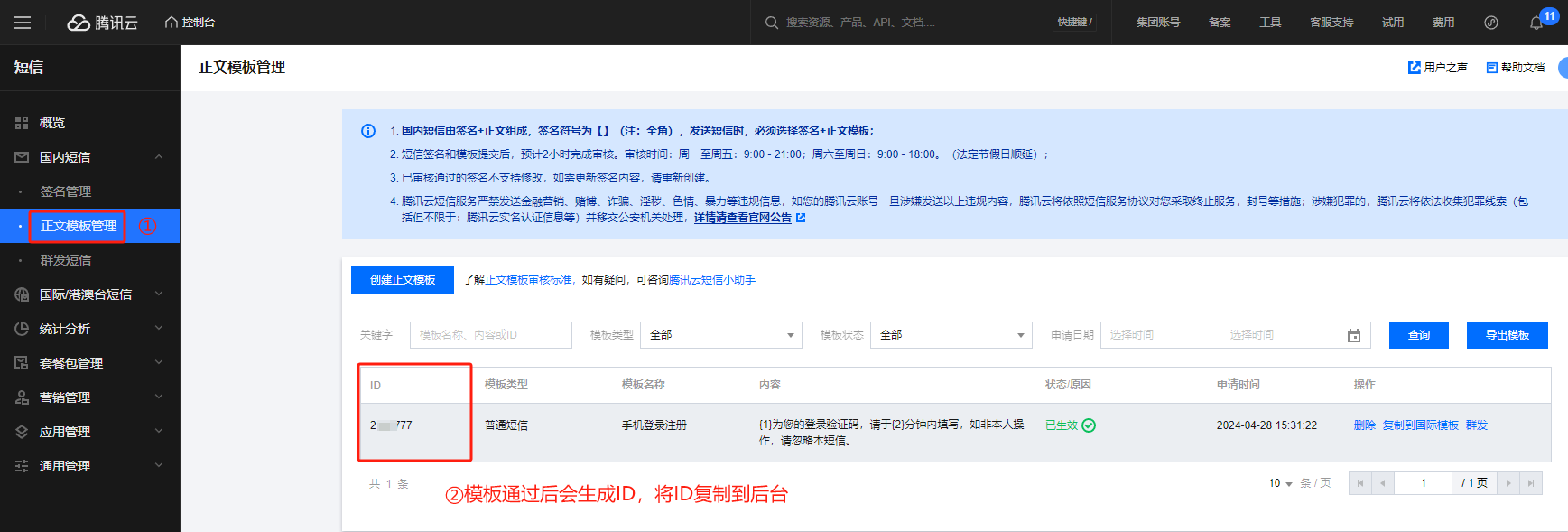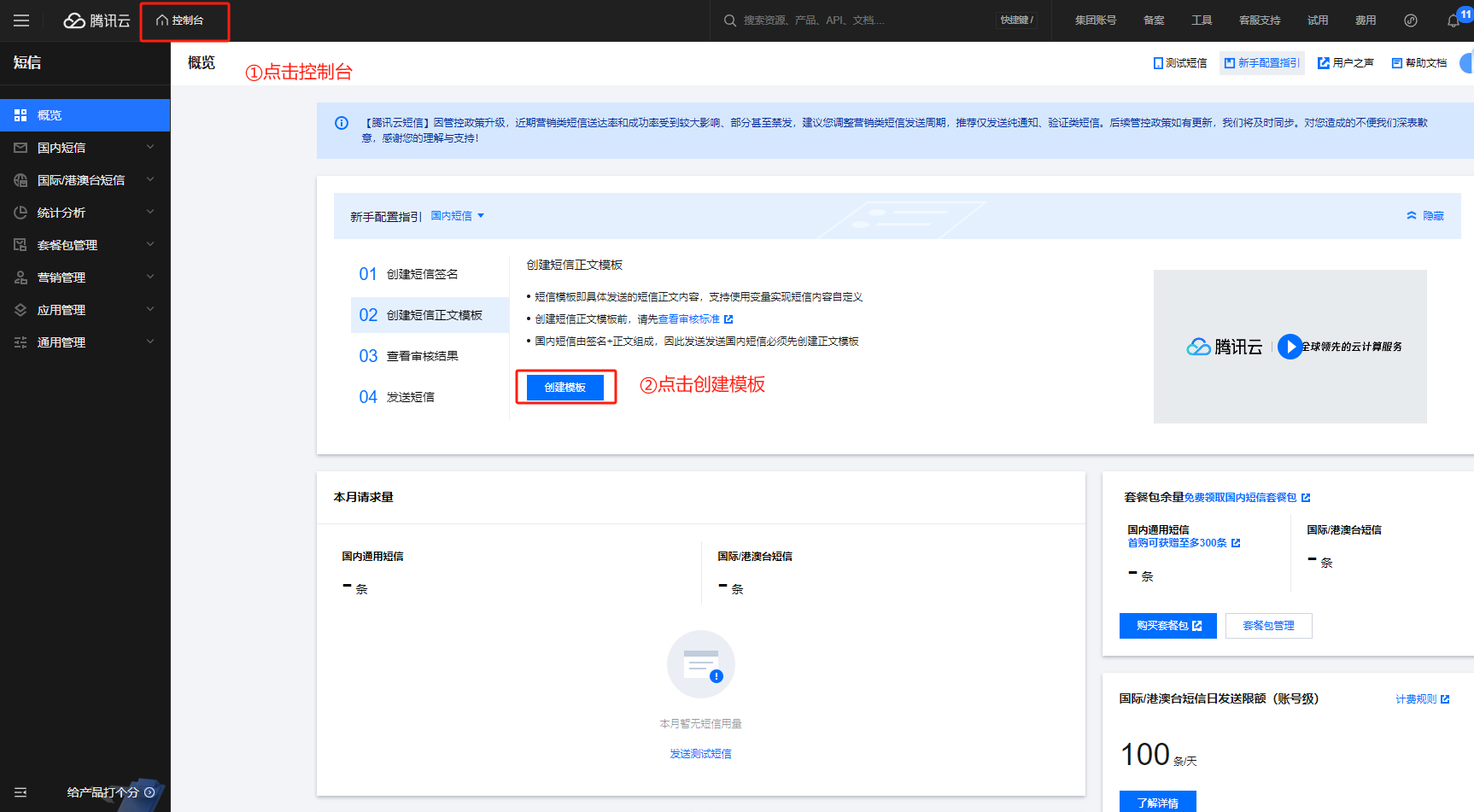 2.获取短信模版ID进入腾讯云平台,点击控制台,搜索短信,点击创建模板