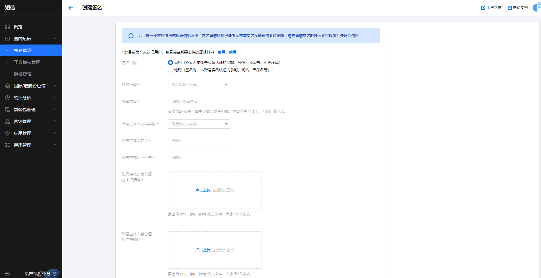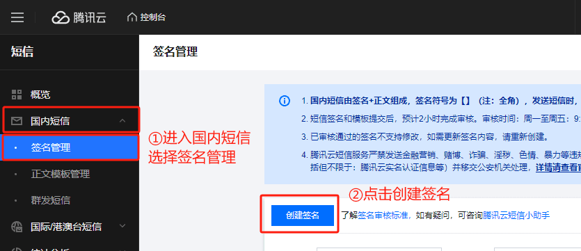 3.进入国内短信,选择签名管理,点击创建签名