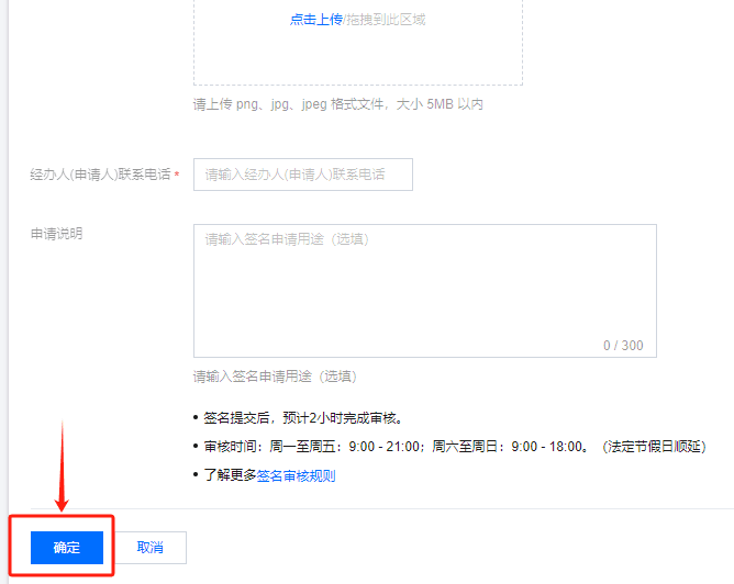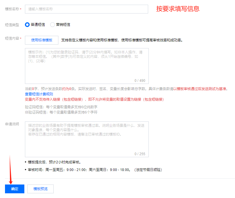 注意:短信签名和模板提交后,预计2小时完成审核。审核时间:周一至周五:9:00 - 21:00;周六至周日:9:00 - 18:00。(法定节假日顺延)