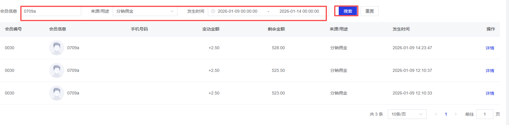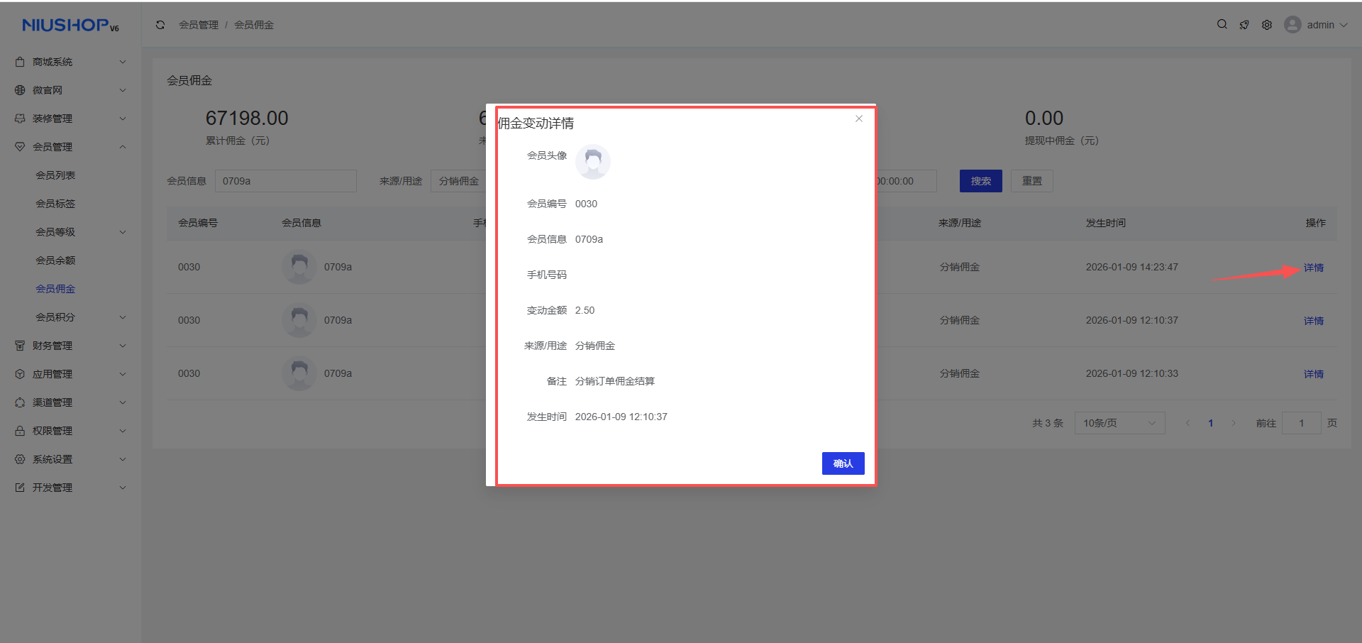 点击详情可查看会员佣金变动详情内容。
