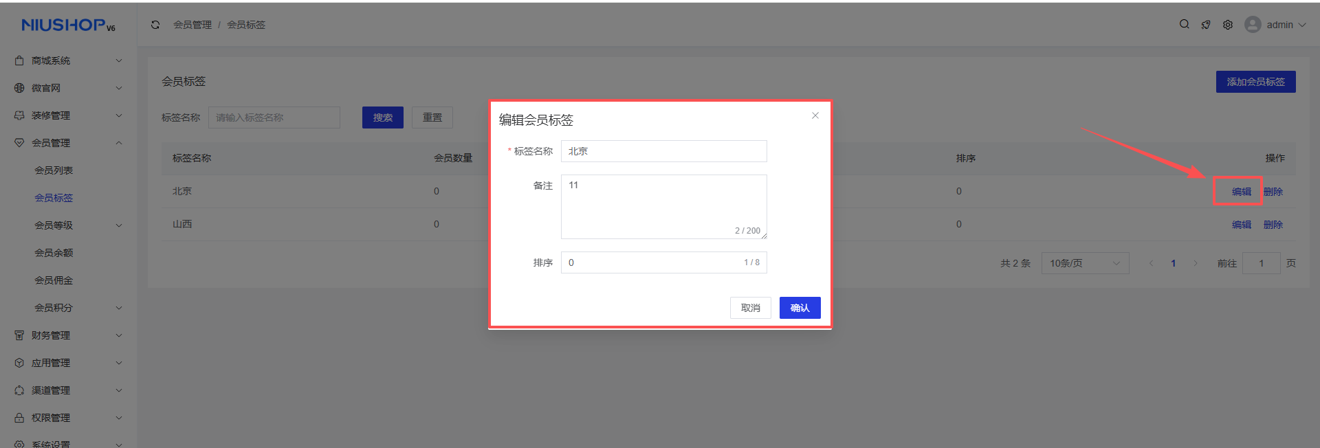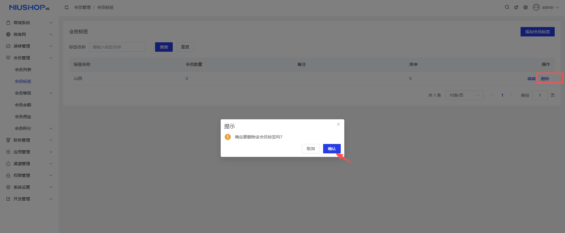 点击删除按钮,确认后即可删除会员标签。