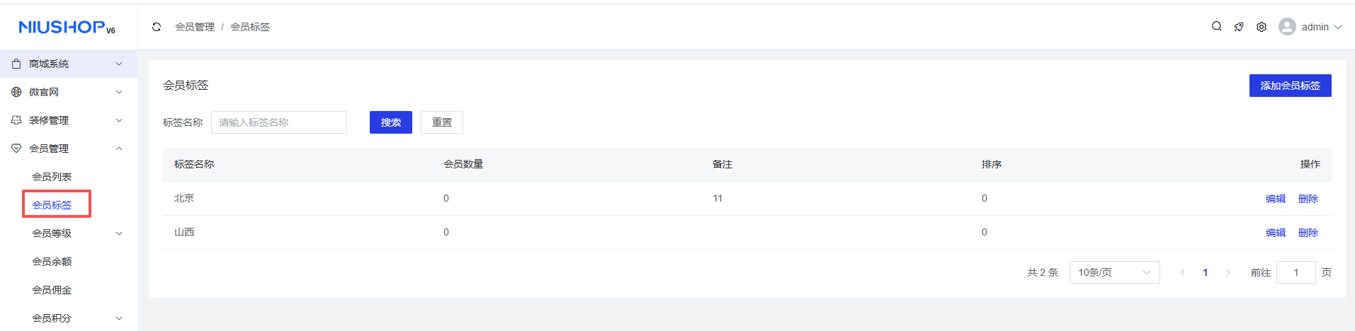 会员标签列表可通过标签名称进行搜索,支持添加/编辑/删除操作