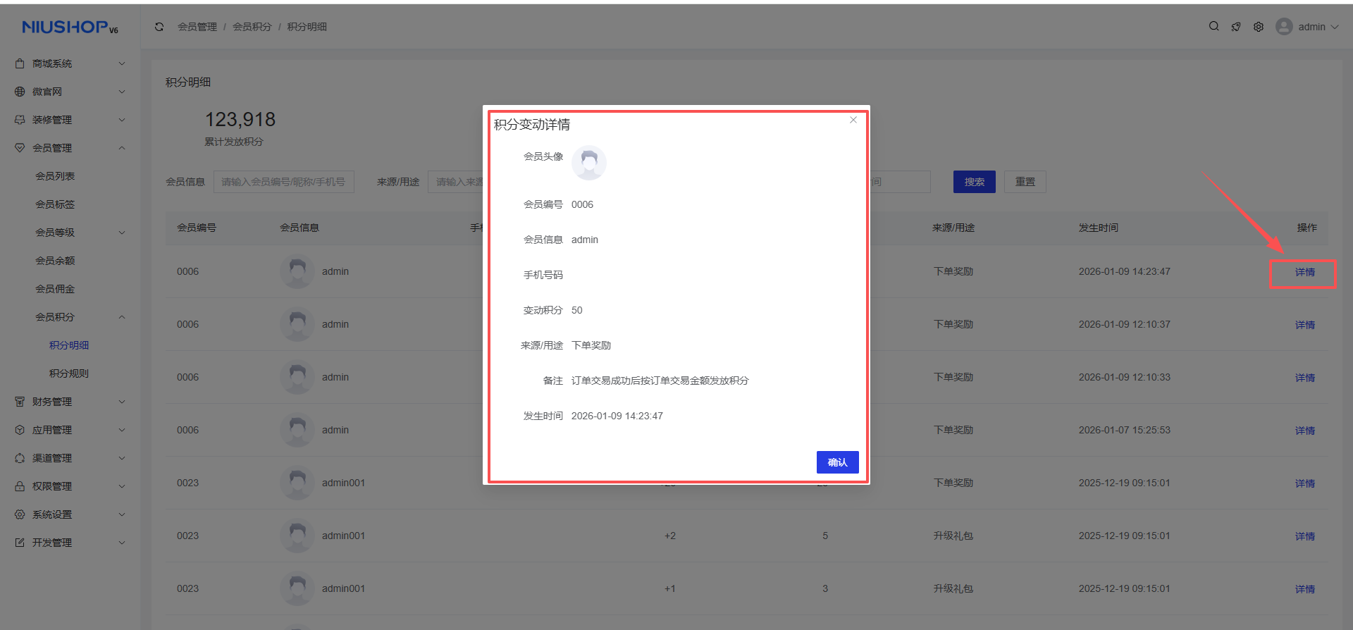 点击详情可查看会员积分变动详情内容。