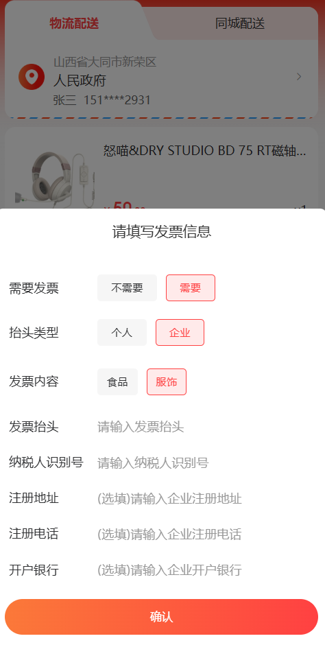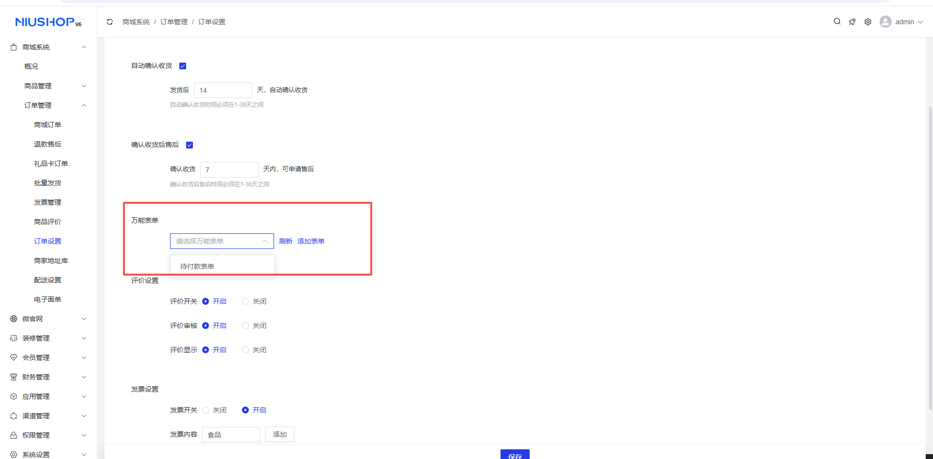 - 发票开关:控制是否启用发票功能,开启后买家可申请开具发票