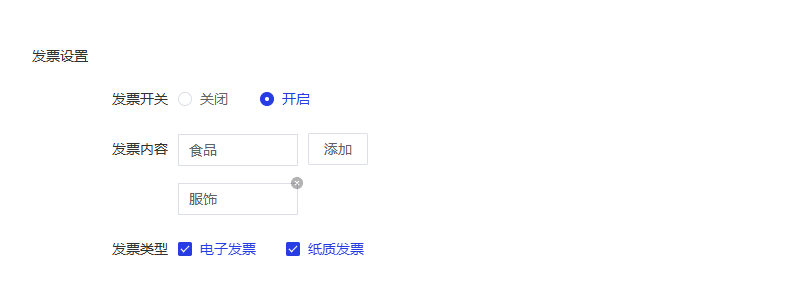 - 发票内容:设置默认发票内容,支持自定义添加