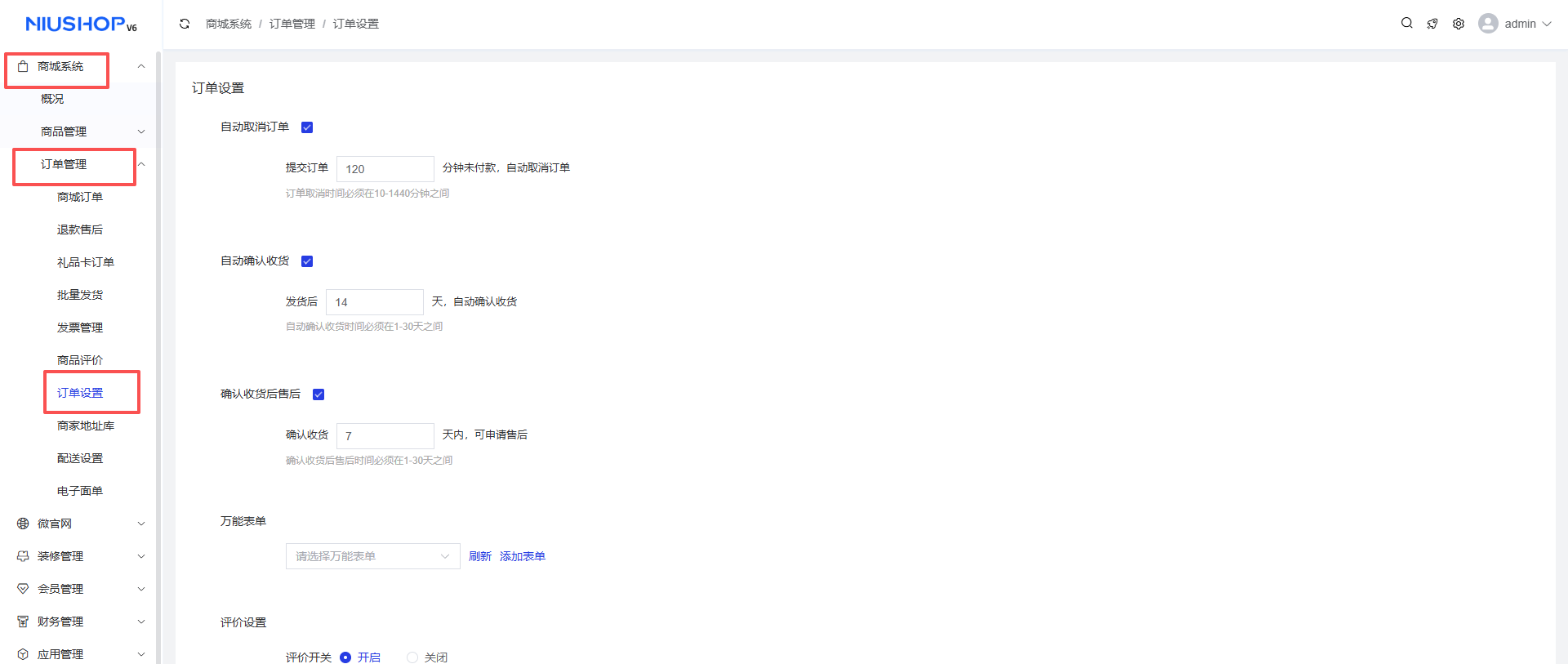 商城系统 > 订单管理 > 订单设置