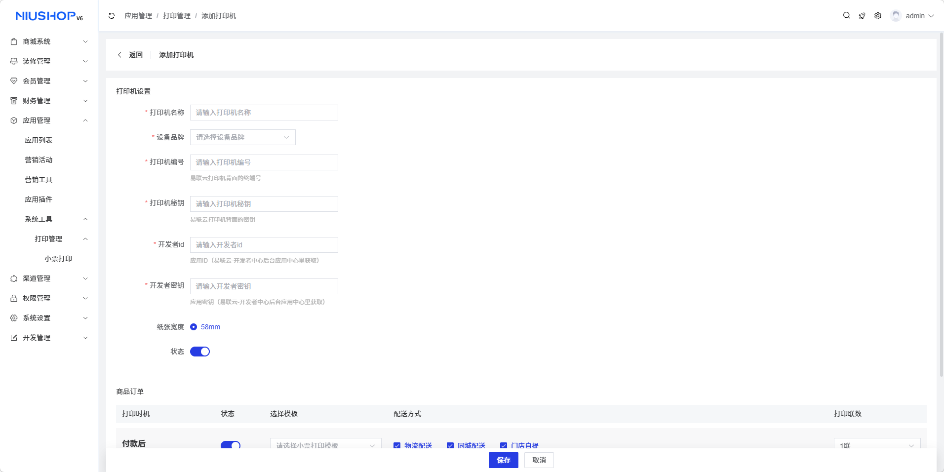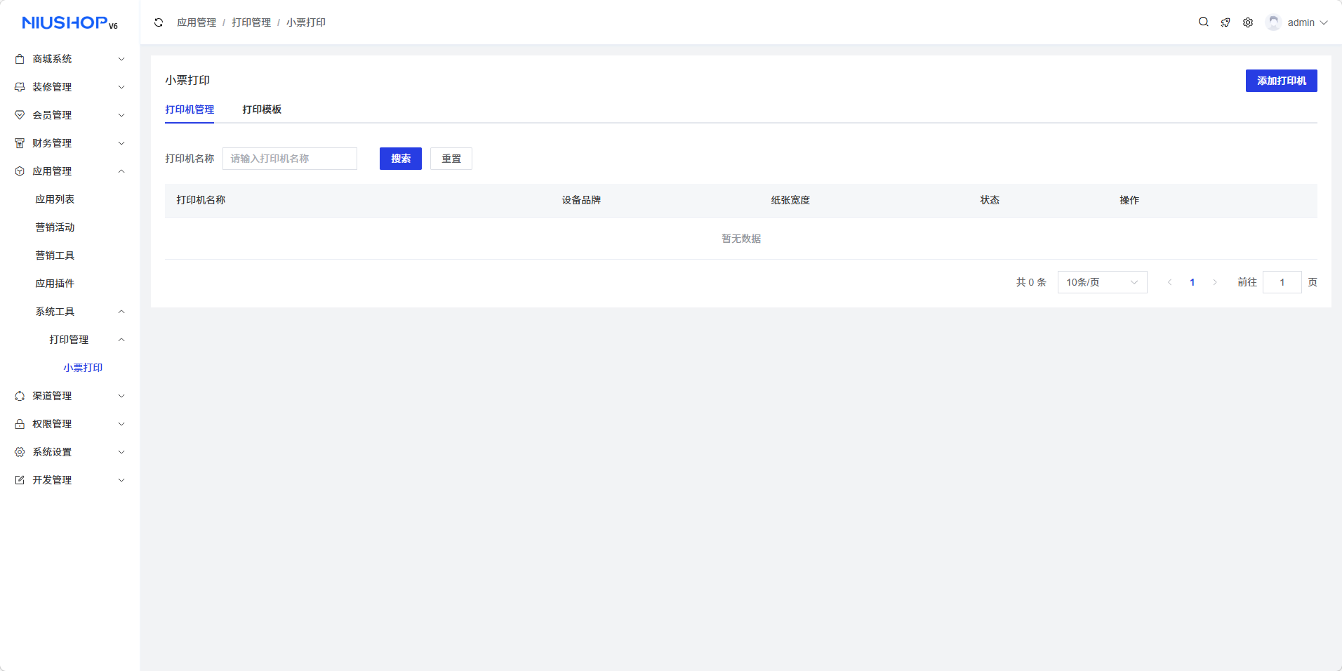 小票打印页面用于管理打印机和打印模板,管理员可以添加打印机设备、设置打印规则和创建打印模板,实现订单小票的自动打印功能。