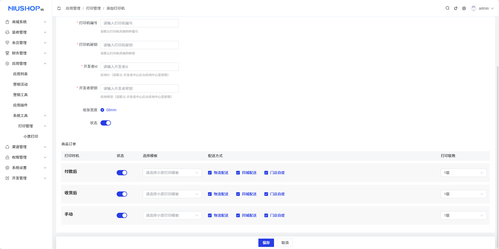 - 收货后:设置收货后是否自动打印,选择打印模板和配送方式