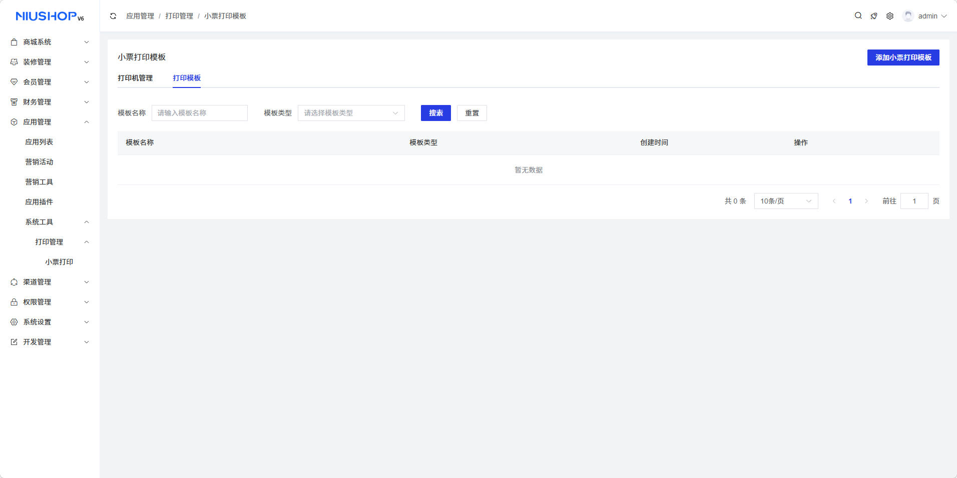 打印模板页面用于管理小票打印模板,管理员可以创建、编辑和删除打印模板。