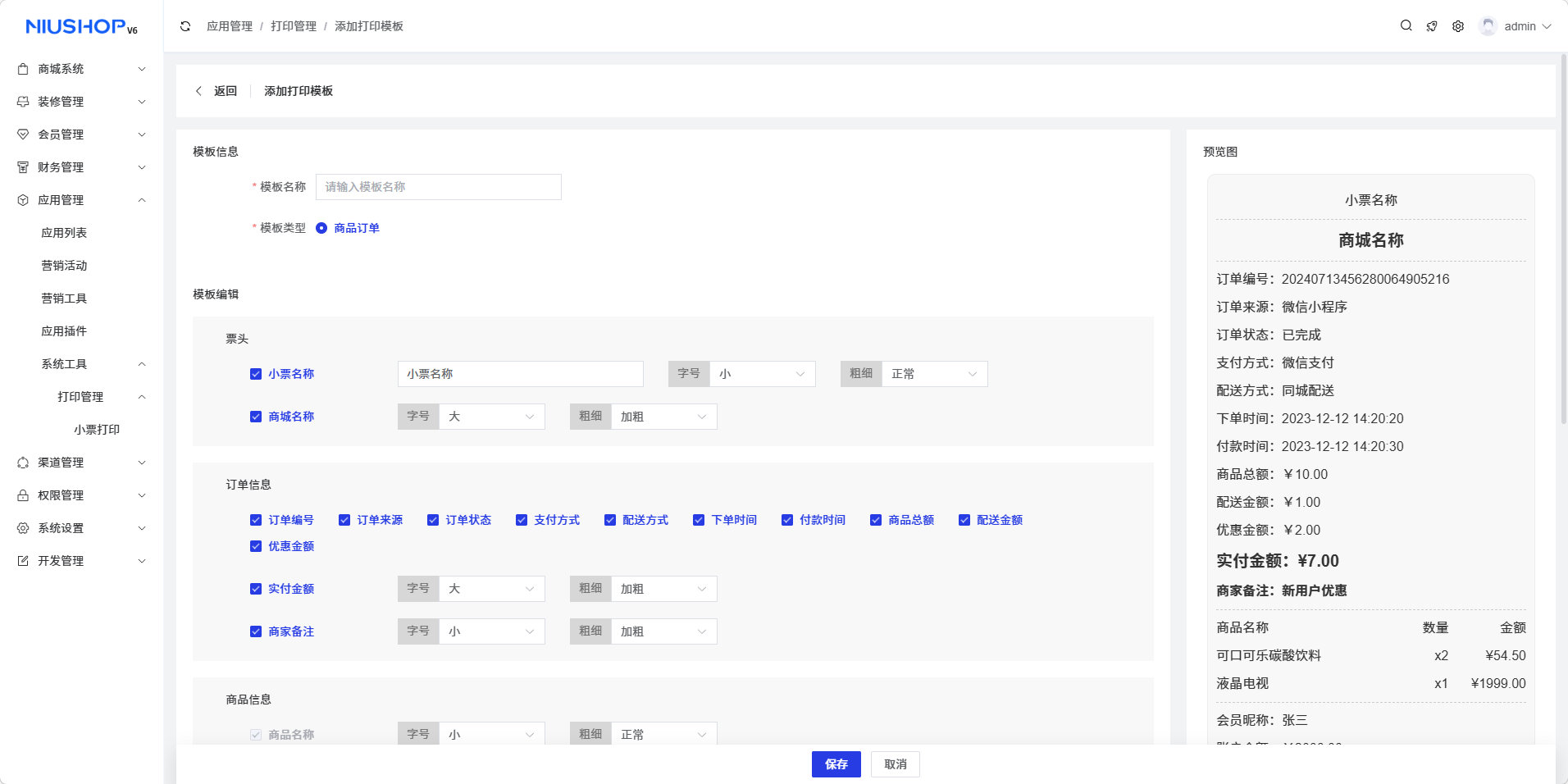 - 商品信息:设置商品信息的显示字段,包括商品名称、数量、金额、会员昵称等
