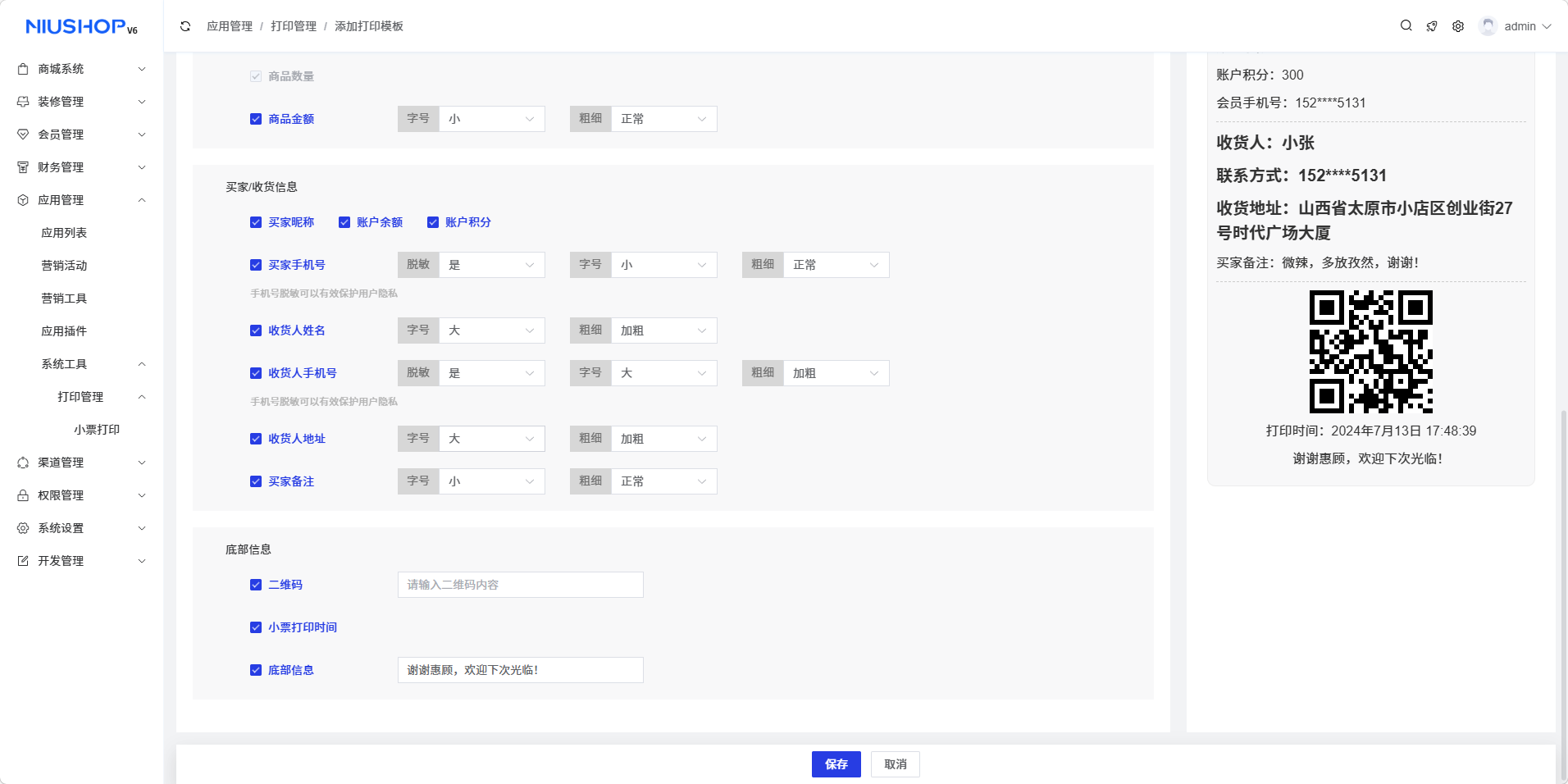 二维码信息和底部信息设置允许管理员自定义小票底部的附加内容,增强品牌形象和用户体验。