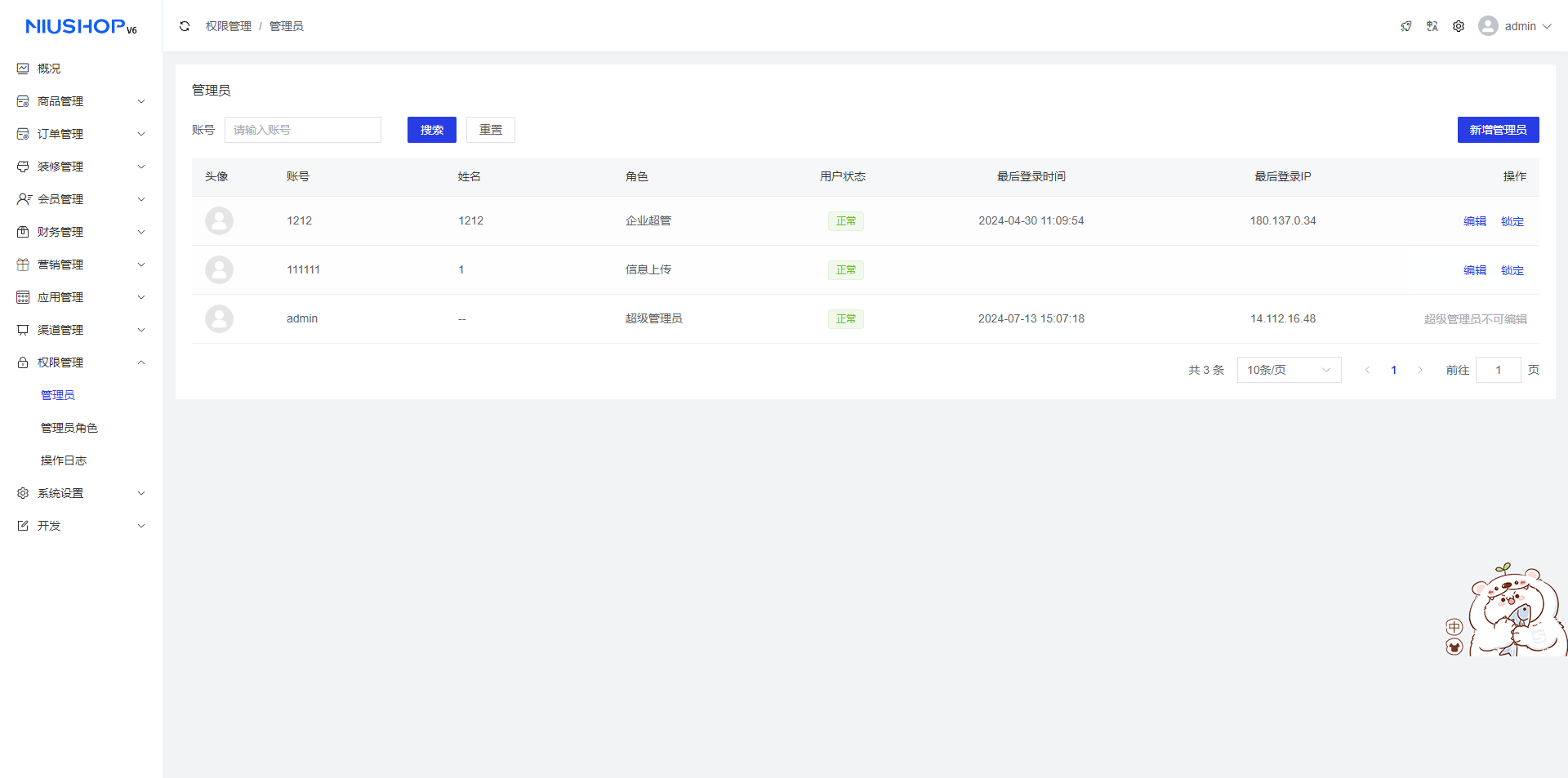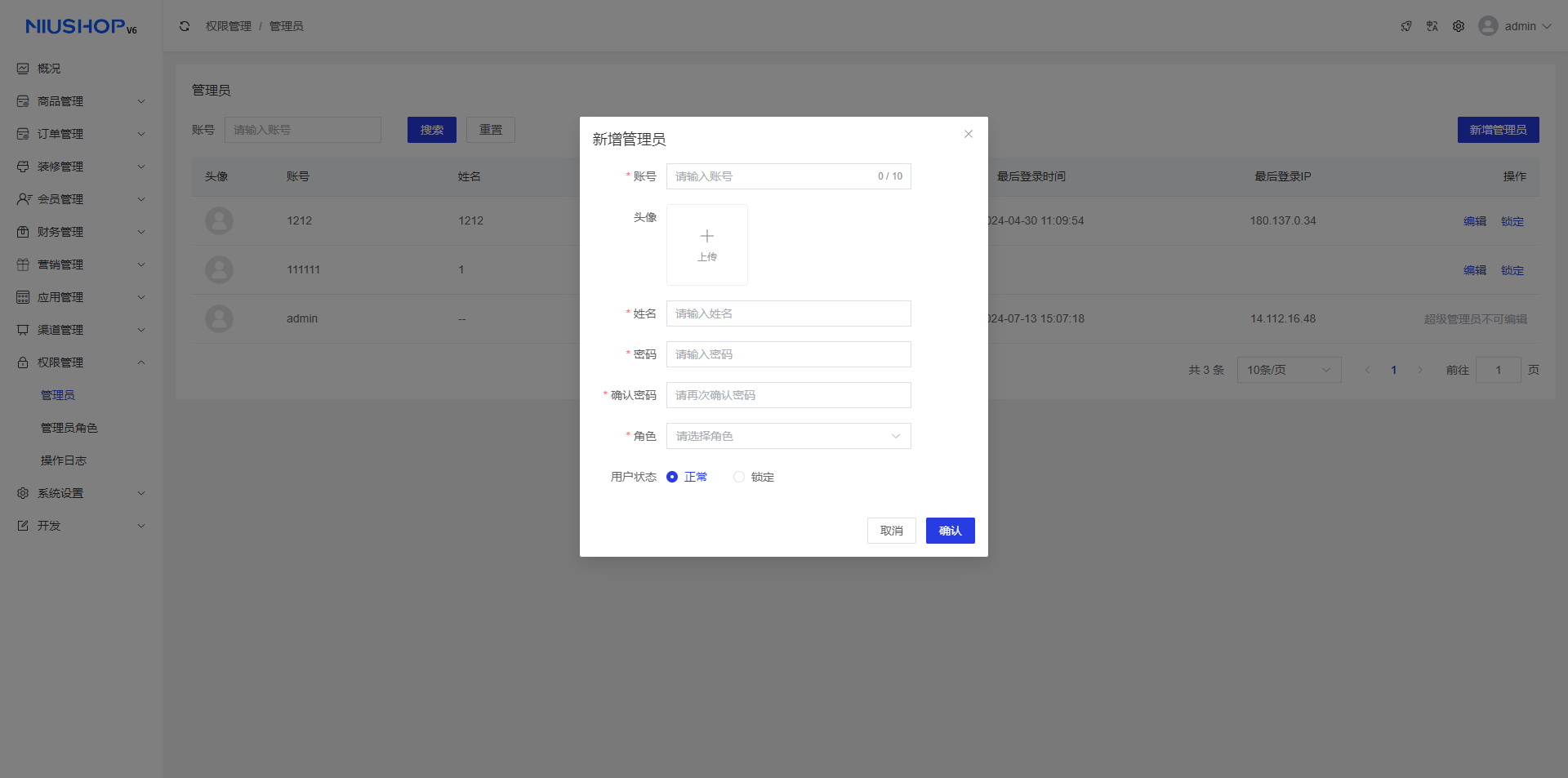 1.新增管理员:点击新建管理员需输入账号姓名以密码,选择操作角色,以及用户状态,点击确认即可新增成功。