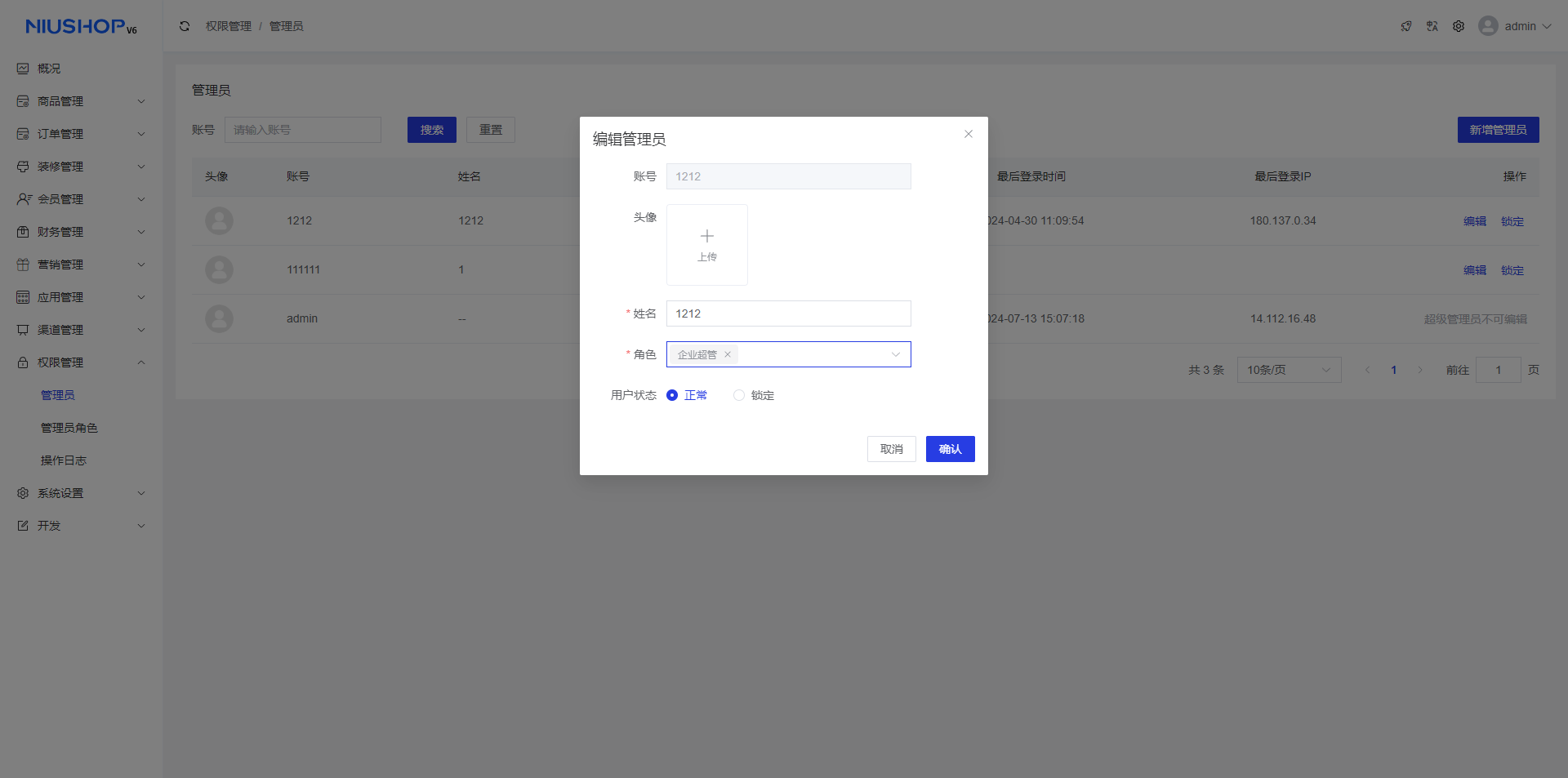 点击编辑可编辑头像、姓名、角色、以及用户状态,点击确认即可修改成功。