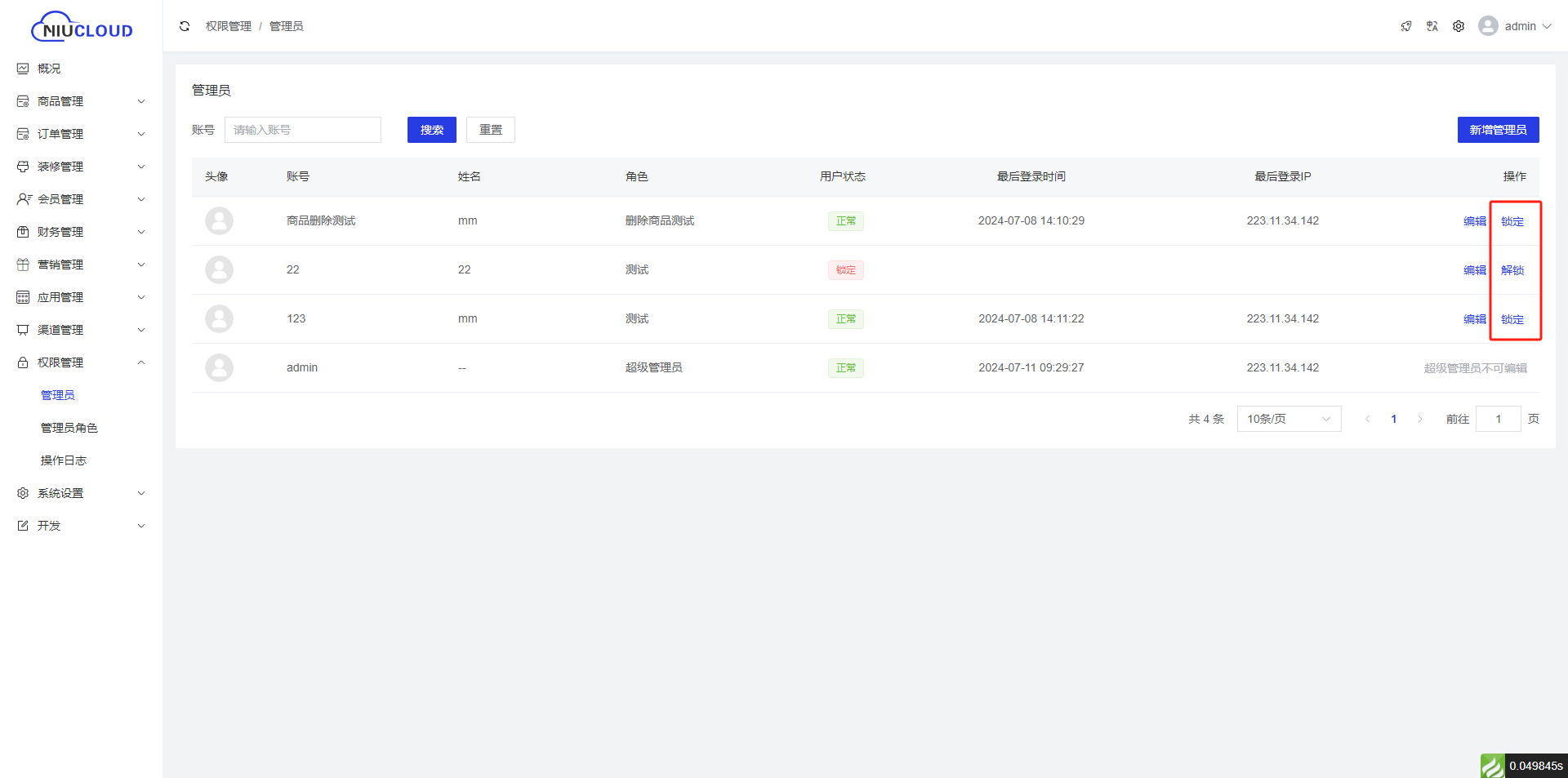 点击锁定/解锁即可控制该管理员是否可以操作后台。
