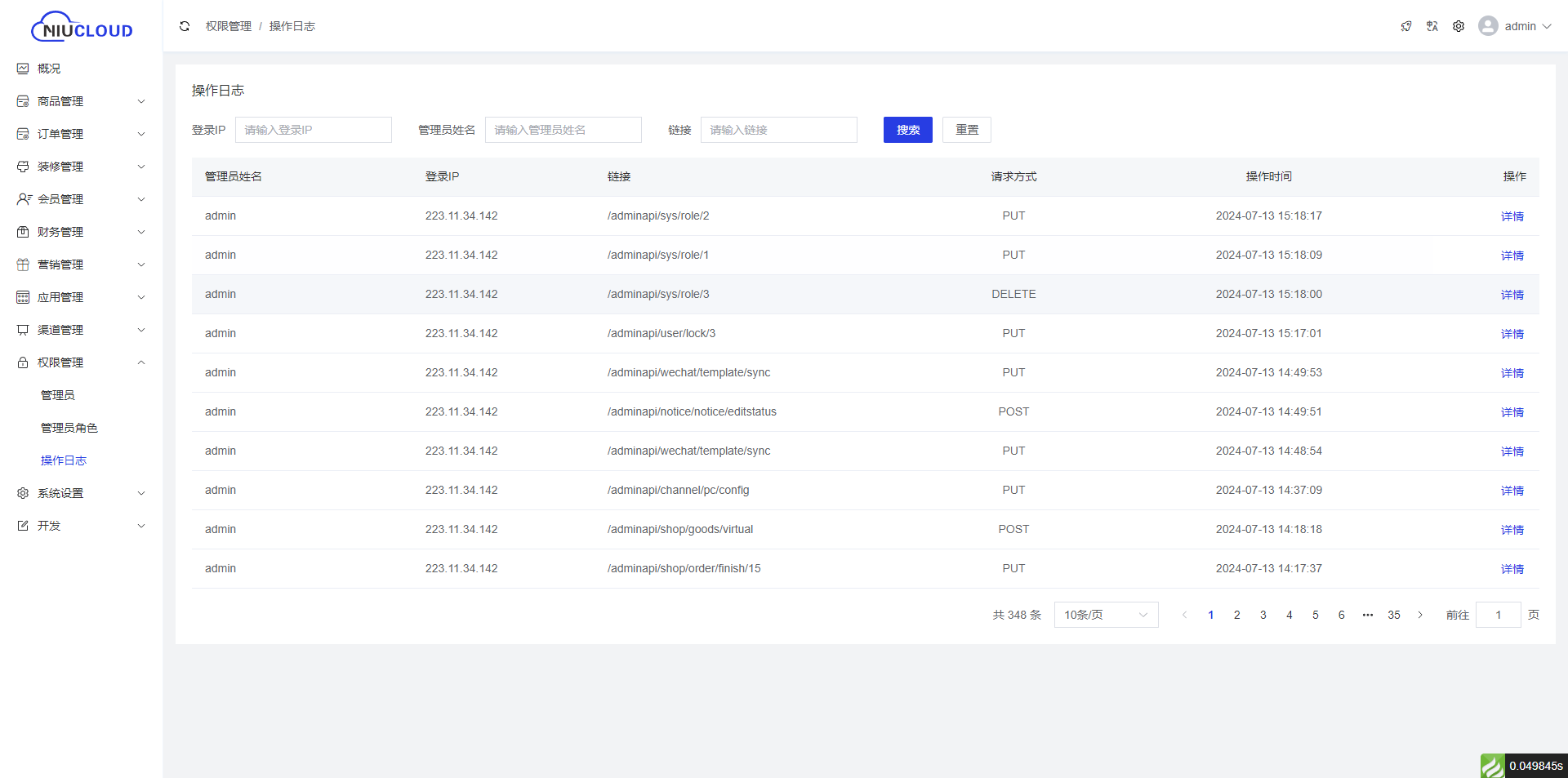 此操作日志只展示该用户的操作日志,可以根据登录IP、管理员姓名、链接即可搜索筛选。