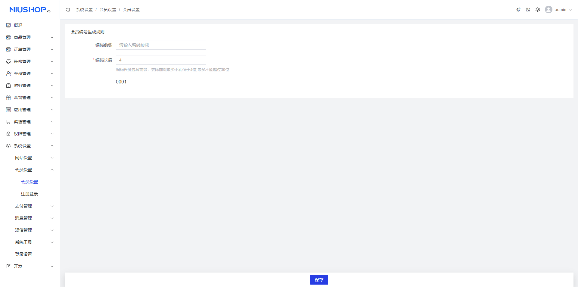 会员编号生成规则可输入编码前缀和编码长度,其中固定长度为4,所以编码长度=编码前缀+4,点击保存即可生效。