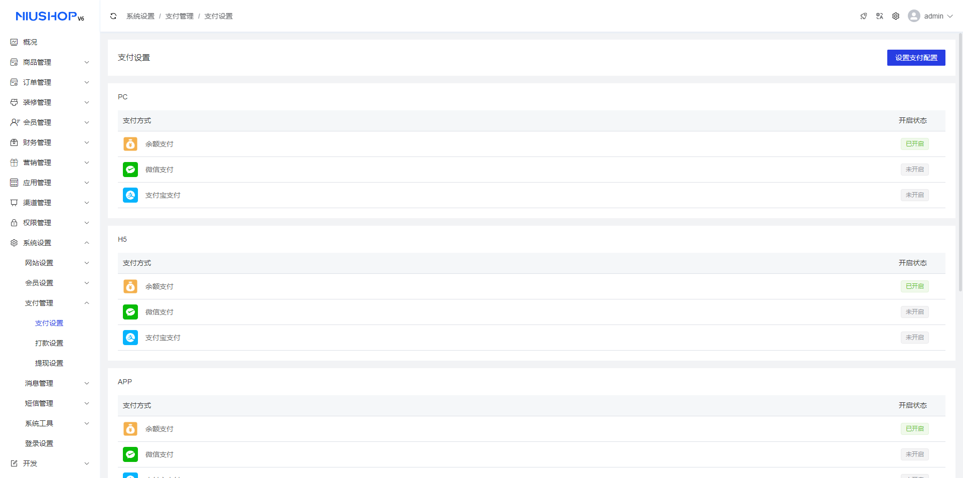 支付设置可设置H5支付、微信公众号、微信小程序支付。