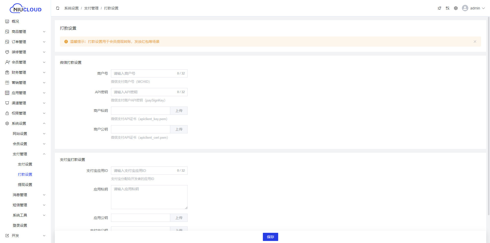 可配置为微信打款设置、支付宝打款设置。