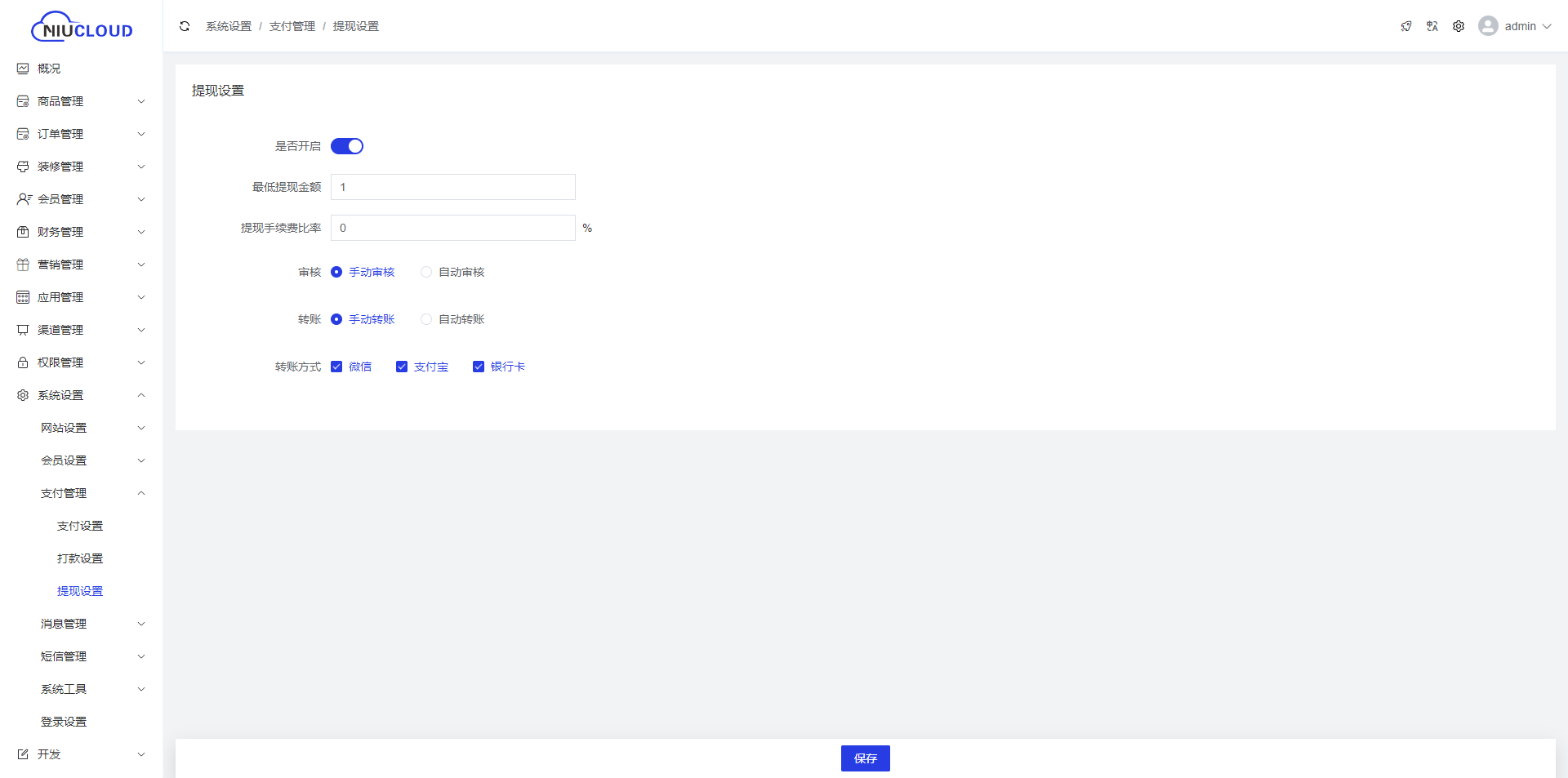 可以设置是否开启提现,最低提现金额,提现手续费比率;审核方式可以选择手动审核自动审核,转账可以选择手动转账自动转账;转账方式可以选择微信支付宝银行卡,点击保存即可设置完成。