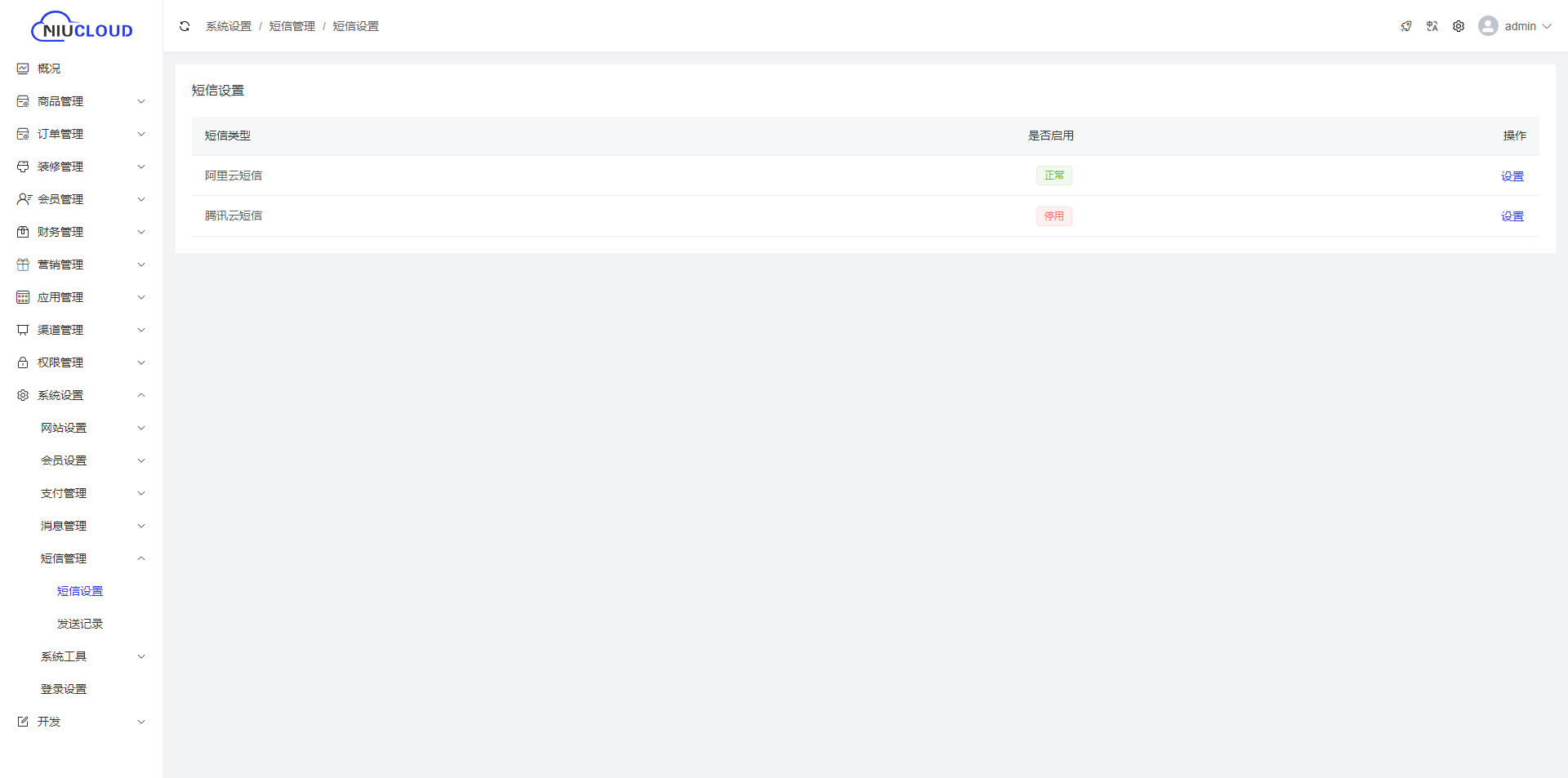 短信发送可选择的服务商有阿里云短信和腾讯云短信,点击设置配置完成后,短信即可使用。