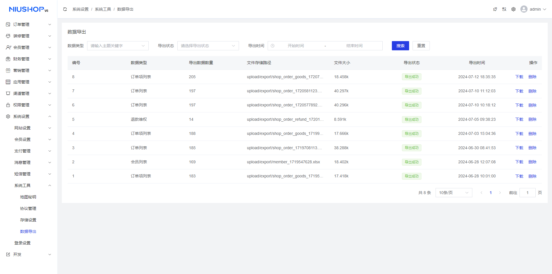 数据导出的数据类型可以订单项列表、订单列表、退款维权、会员列表。