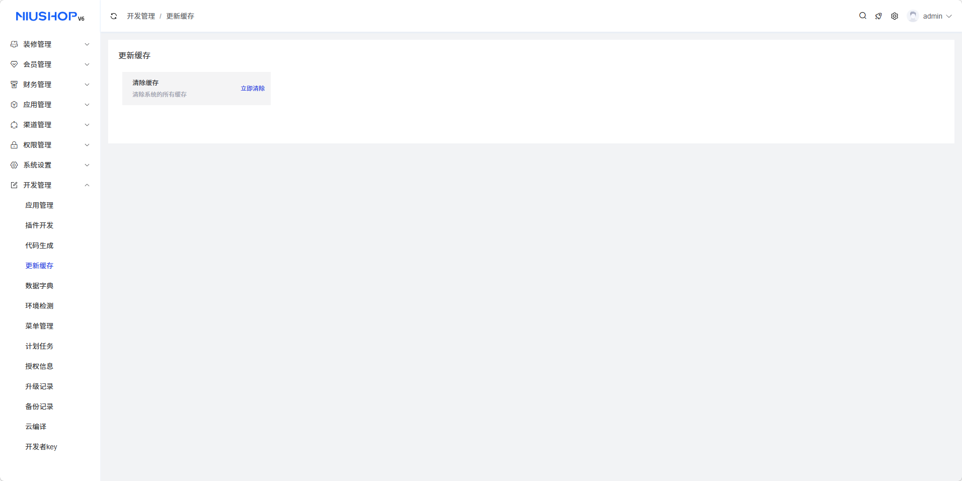 更新缓存页面用于清除系统缓存,用户可以通过点击按钮清除系统的所有缓存,确保系统数据的实时性和准确性。