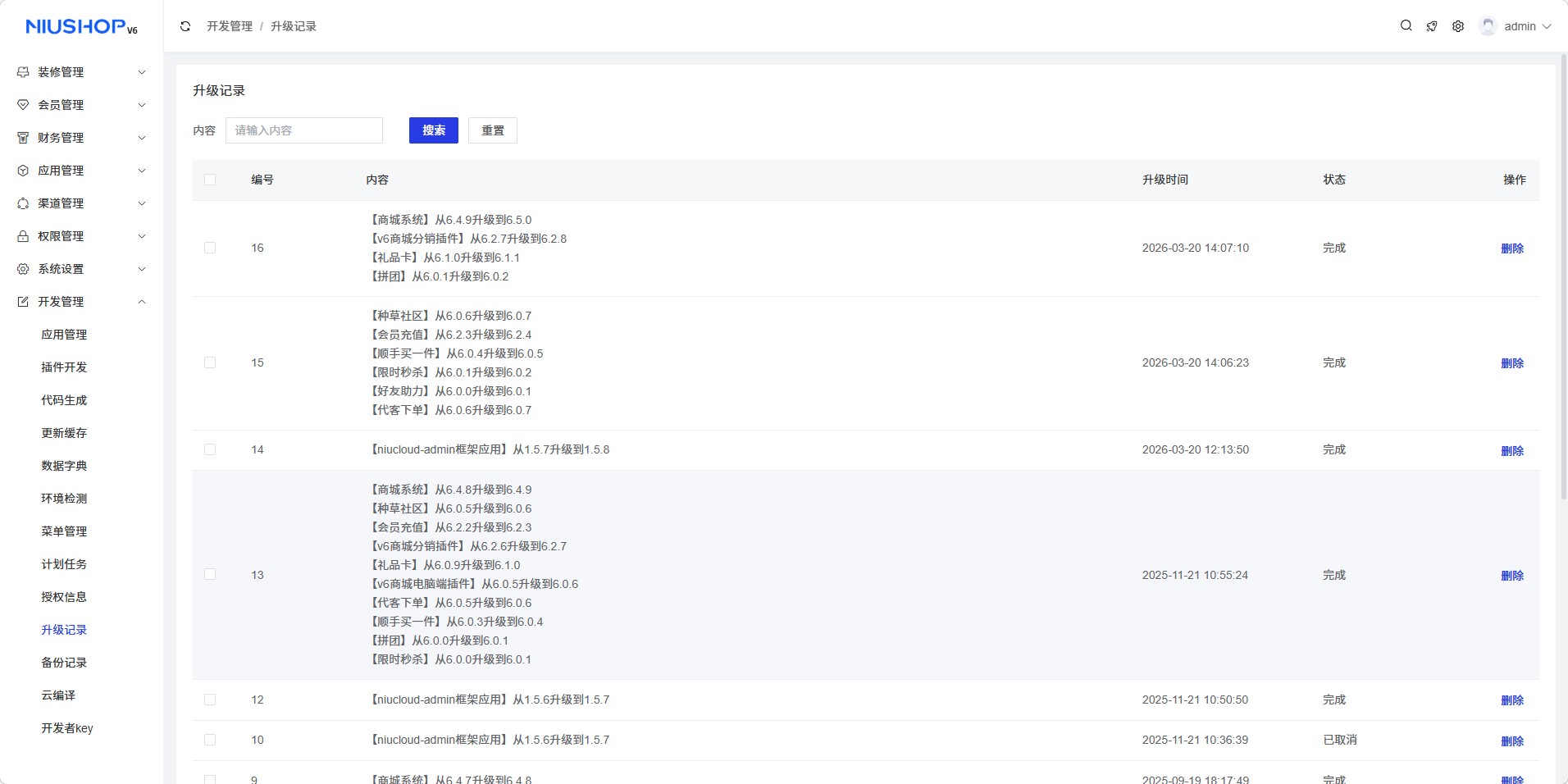 升级记录页面展示了系统的升级历史记录,帮助用户了解系统的更新情况。