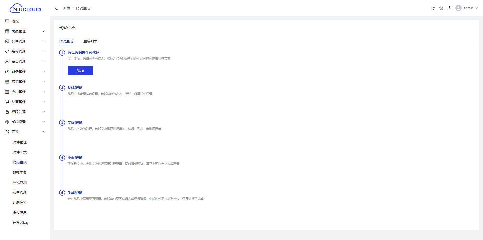 点击添加,选择对应数据表,添加之后会跳转到对应生成代码的配置管理页面,代码生成查看基础设置,包括基础的表名、描述、所属插件设置,代码中字段的管理,包括字段是否进行增加、编辑、列表、查询展示等,正在开发中,会将字段进行展示管理配置,同时提供预览,真正实现自定义表单配置,针对代码中展示页面配置,包括单独页面编辑表单还是弹框,生成的代码穿插到系统中还是进行下载等。