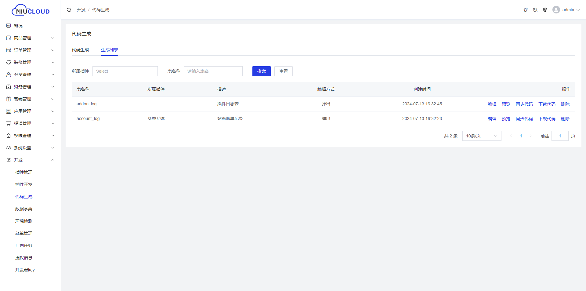 生成后的代码会在生成列表中展示,可供编辑、预览、同步代码、下载代码、删除