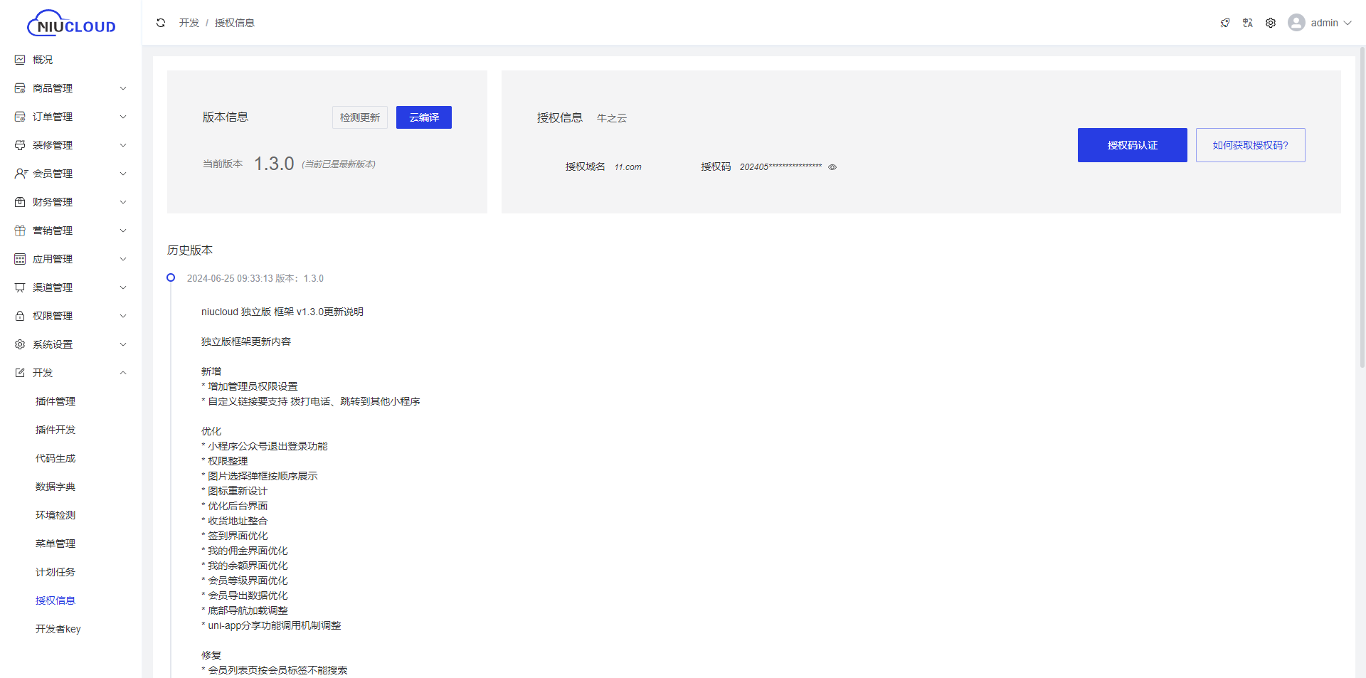 授权信息内展示框架的版本信息,可以在此处查看每次升级的版本更新说明,也可以再此处绑定授权认证信息,此处也可以云编译框架,例如,更新升级插件时,框架也升级了,需要在授权信息出云编译框架内容后再升级编译插件内容。