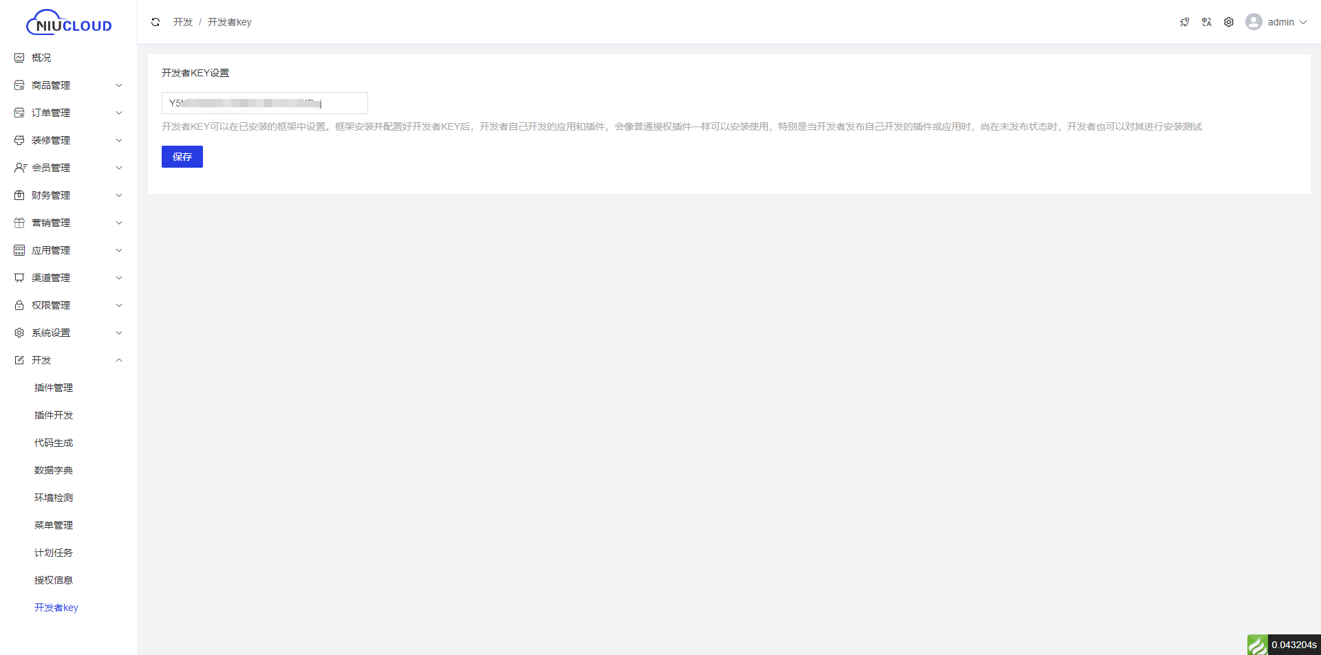 开发者KEY可以在已安装的框架中设置。框架安装并配置好开发者KEY后,开发者自己开发的应用和插件,会像普通授权插件一样可以安装使用,特别是当开发者发布自己开发的插件或应用时,尚在未发布状态时,开发者也可以对其进行安装测试,在次输入开发者key点击保存,即可在插件管理中看到开发者自己开发的未发布状态插件和应用,开发者也可以对其进行安装测试。