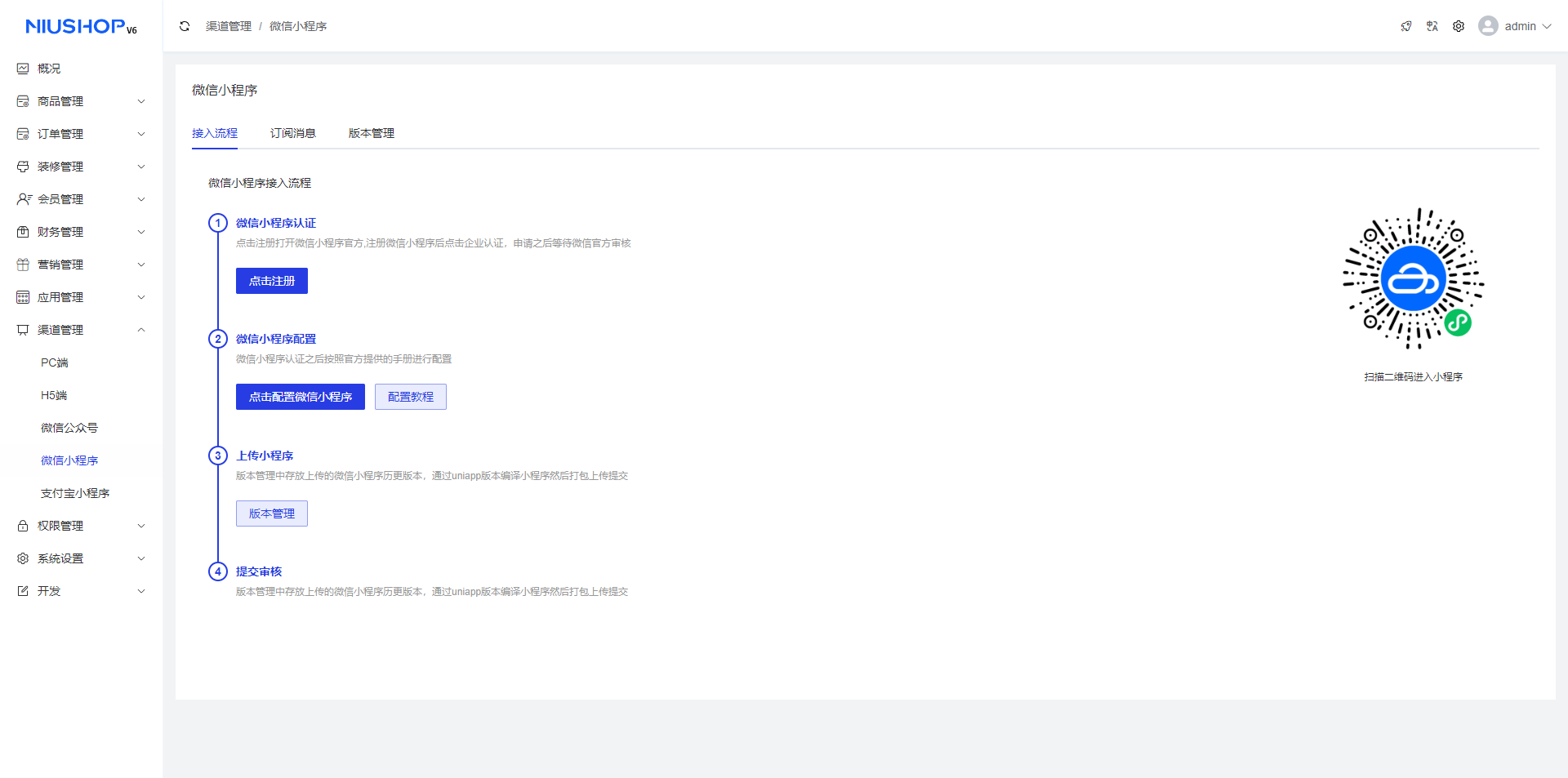 2.点击配置微信小程序:配置文档详见https://e.gitee.com/niuteam/repos/niuteam/v6-operation-manual/blob/c2e8c1032e69c5b8c055513359e3f751002f21c1/yi-3001-xiao-cheng-xu-pei-zhi.md