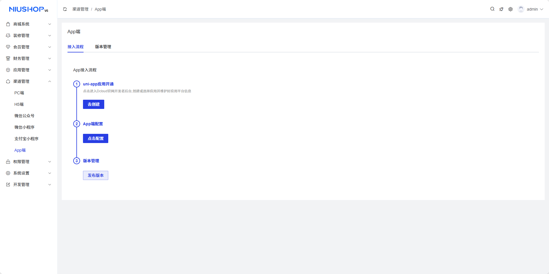 App端页面用于配置和管理App应用的接入和版本管理,帮助商家快速接入App应用,实现App的开发、配置和版本更新。
