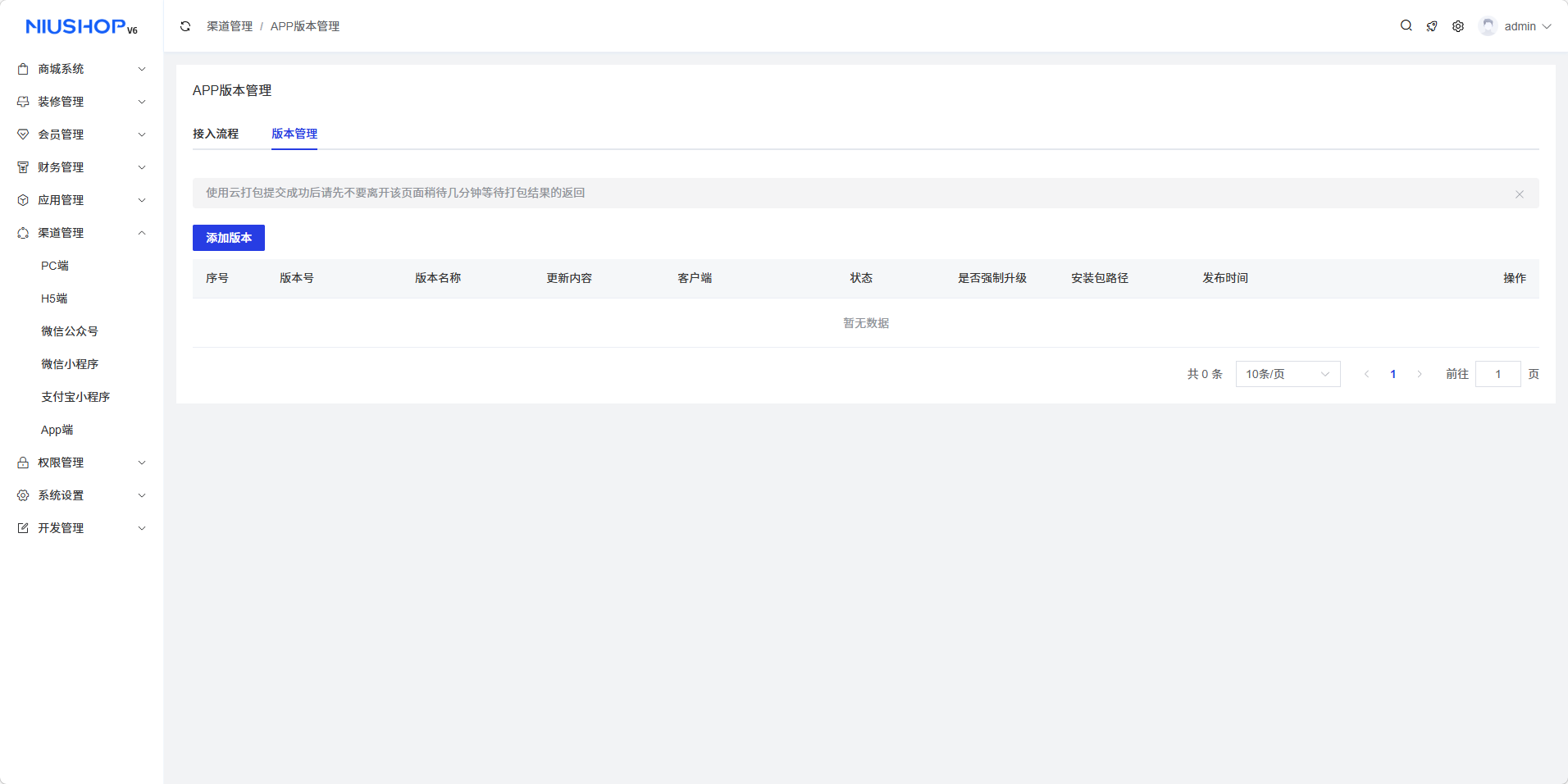 - 版本列表:显示已发布的版本信息,包括版本名称、版本号、更新内容、客户端类型、状态、是否强制升级、安装包路径、发布时间等