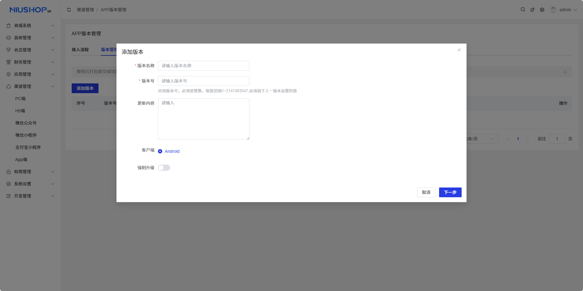 点击"添加版本"按钮,弹出添加版本弹窗,用于配置新版本的各项信息。