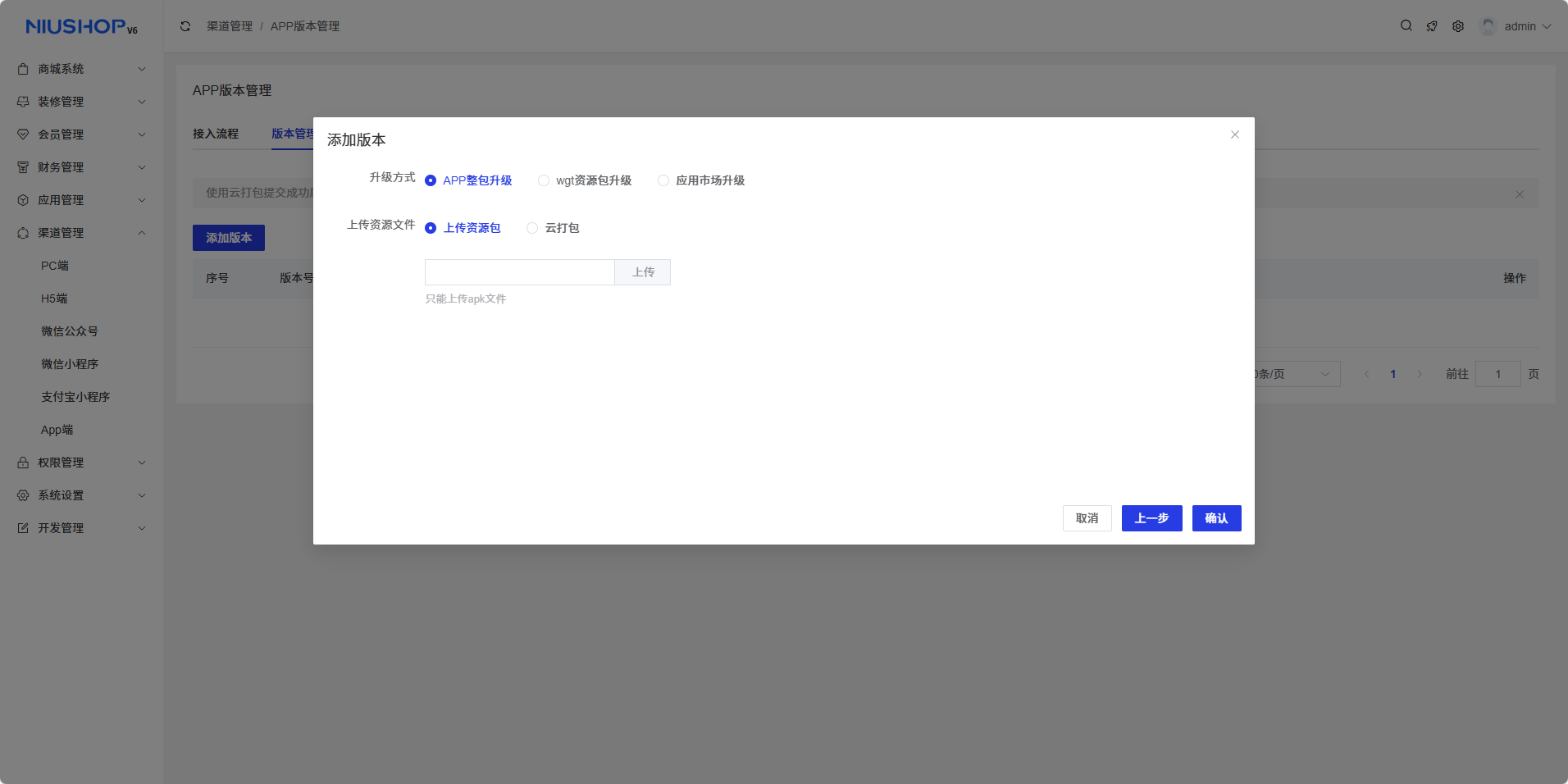 - APP整包升级:选择整包升级方式,用户需要下载完整的App安装包进行升级