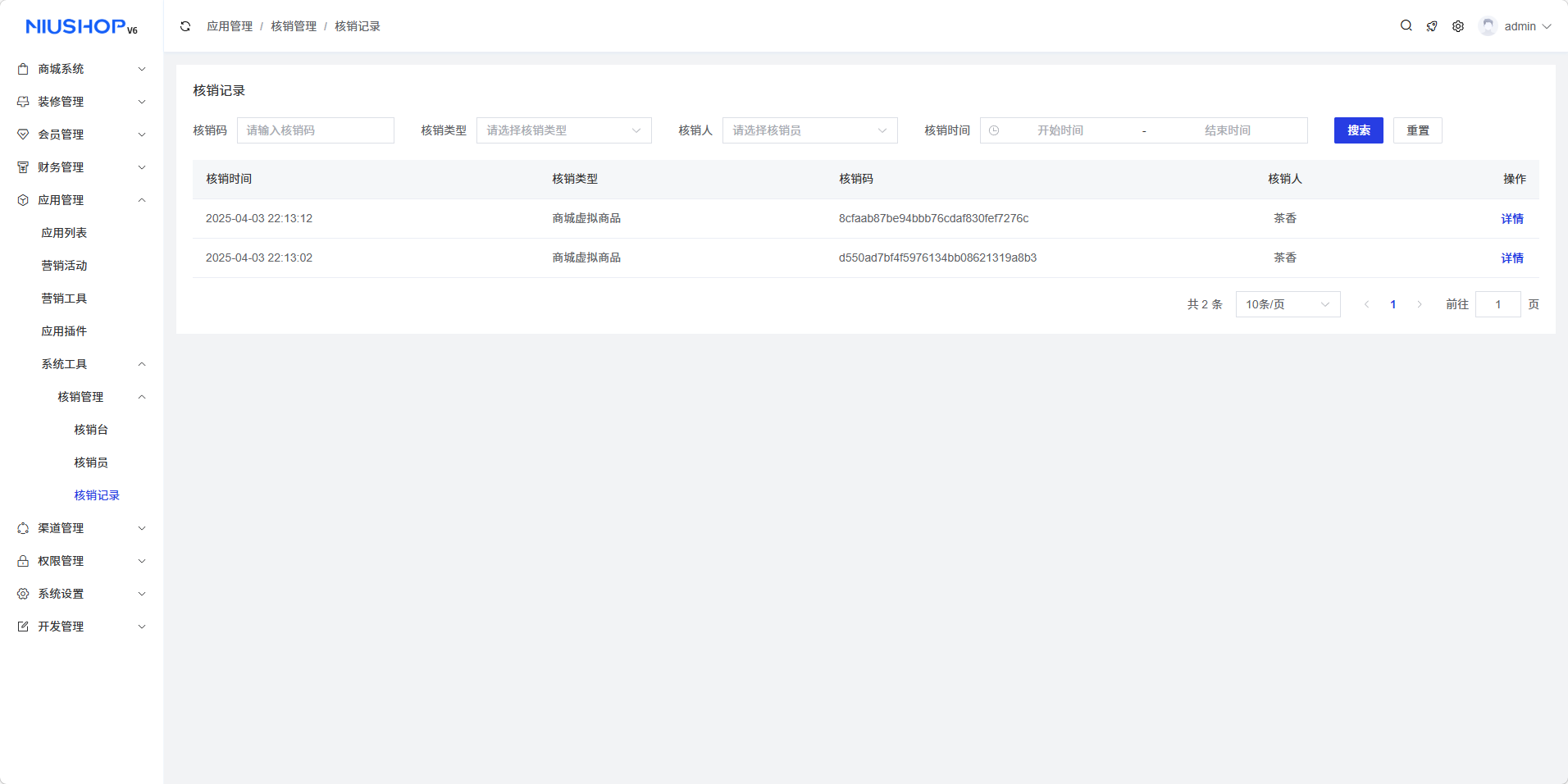 点击操作栏的"详情"按钮,可以查看该核销记录的详细信息,包括核销商品信息、核销时间、核销员等详细内容。